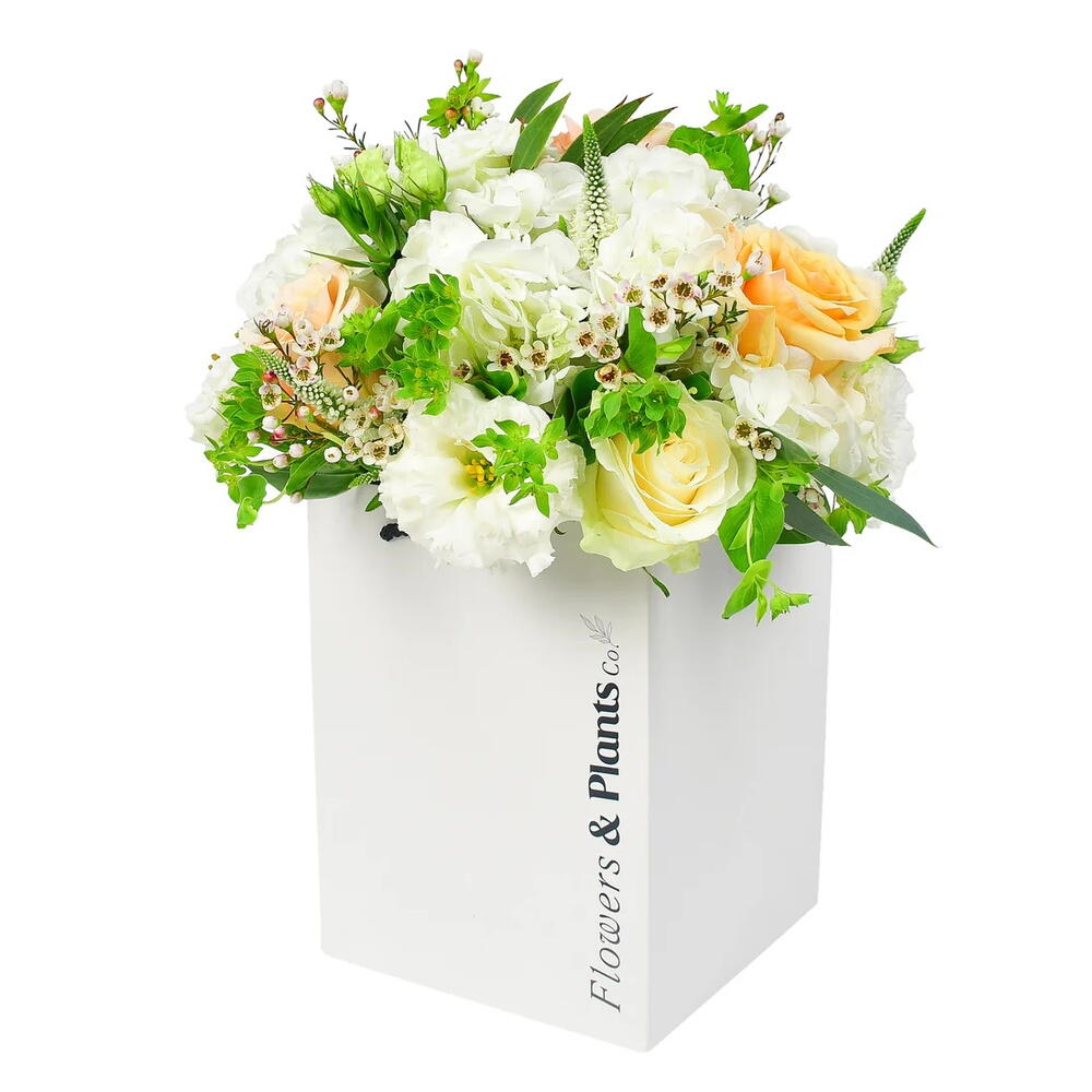 white lisianthus - 5 шт. white veronica - 5 шт. white hydrangea - 2 шт. white wax flower - 5 шт. белые розы персикового оттенка - 5 шт.
