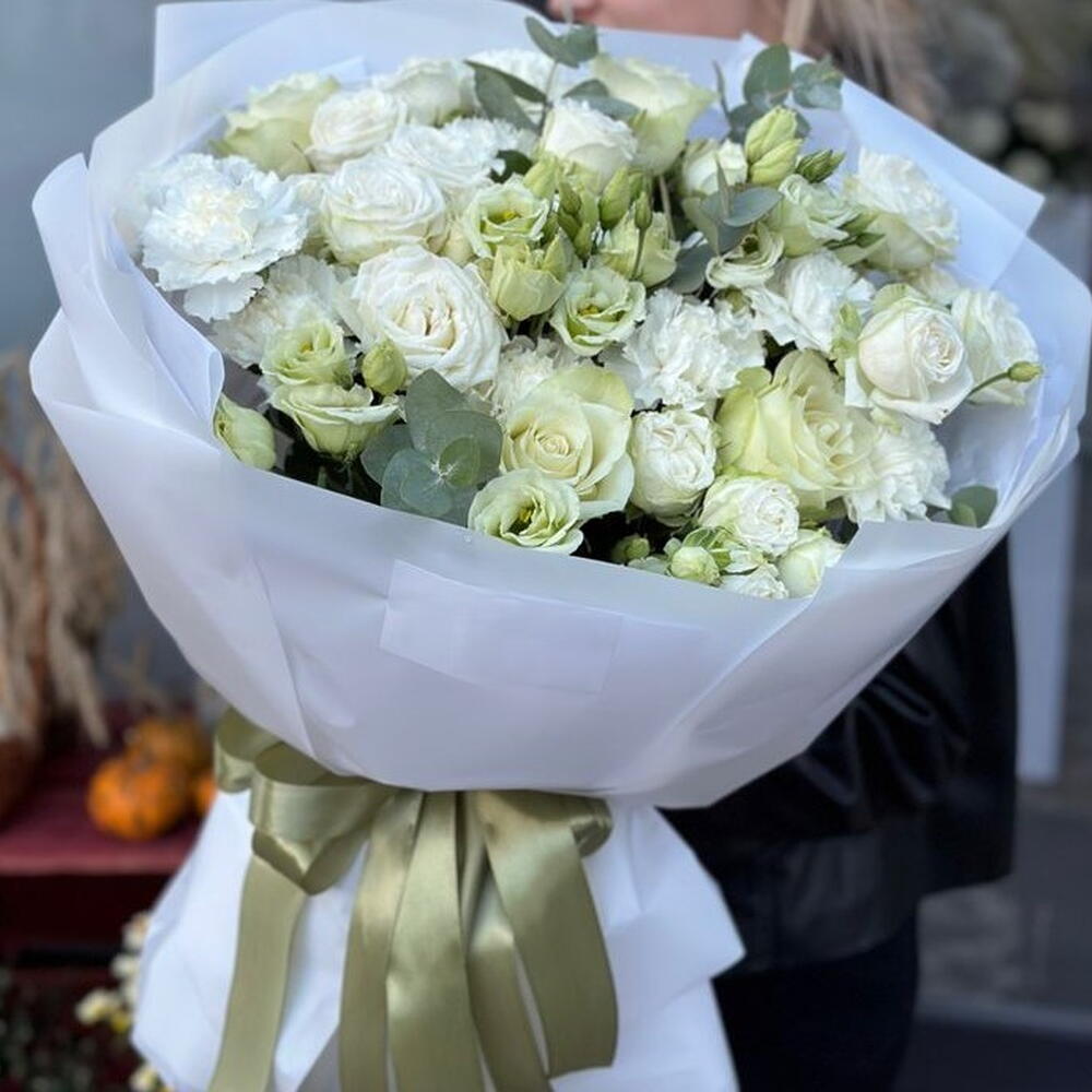 Eucalyptus - 10 шт. white carnations - 10 шт. white lisianthus - 10 шт. сезонная листва - 10 шт. white roses - 10 шт.