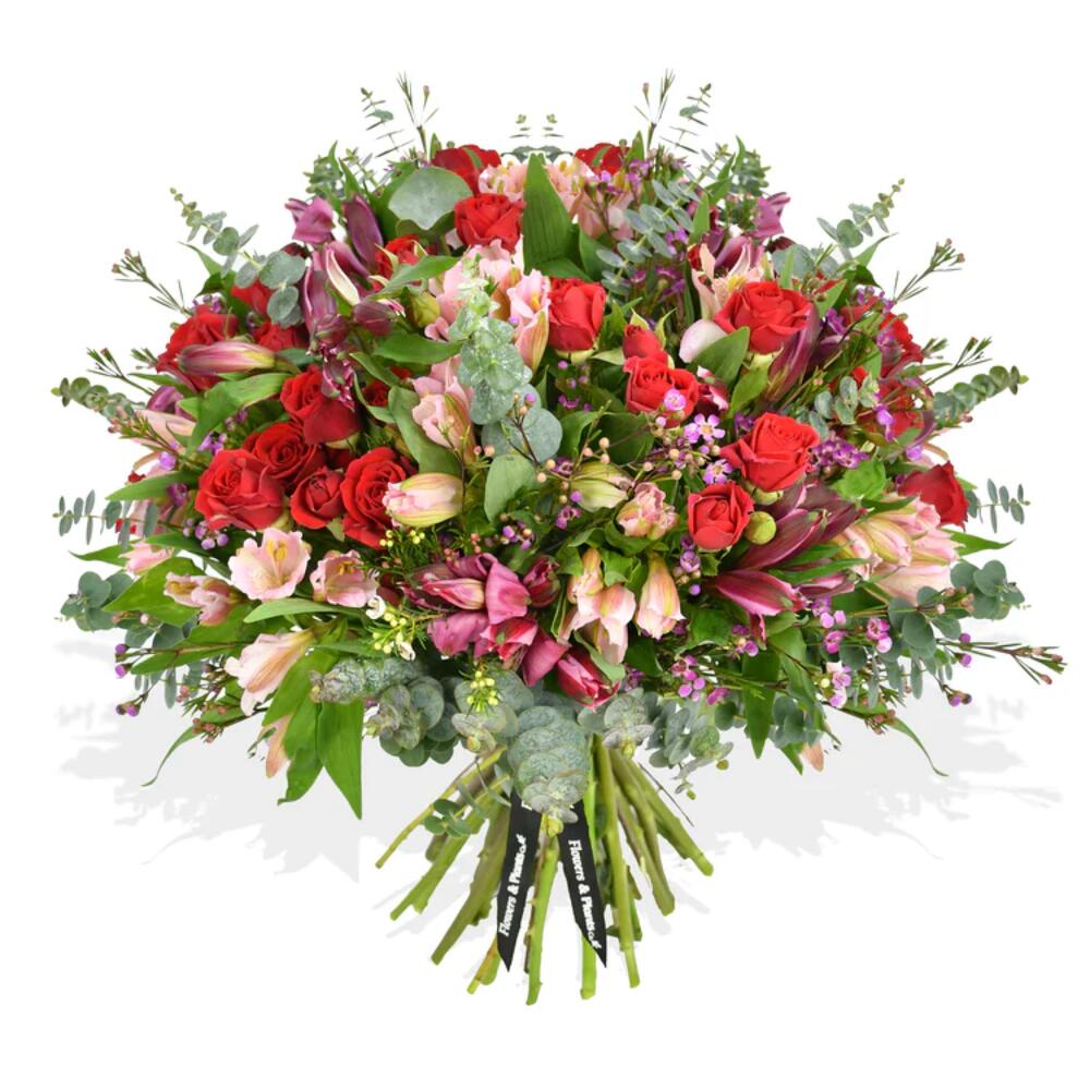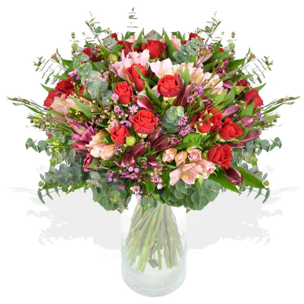 Изобилие цвета и текстуры, этот букет включает все наши любимые цветы. Взрываясь красными розами-спреями, альстромерией, восковым цветком и великолепным эвкалиптом 'baby blue', он является правильным выбором для всех самых романтических случаев.