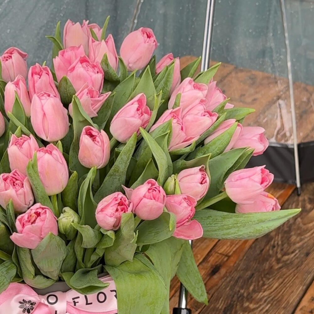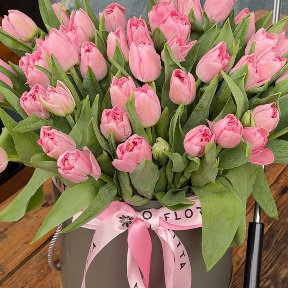 A romantic arrangement of fresh pink tulips presented in an elegant hatbox. Soft, dreamy and full of charm — perfect for birthdays, romantic gifts or simply to brighten someones day.