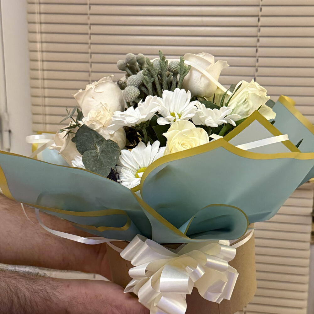 • 4 стебля премиальных белых роз • 3 стебля белых спрей-роз • 5 стеблей белых ромашковых хризантем • 2 стебля ягод брунии • 3 стебля эвкалиптовой зелени • сезонная вечнозелёная зелень - 10 см