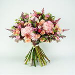 Пышный букет, связанный вручную, который передаёт тихую романтику осени. Нежно-розовые и тёмно-бордовые розы переплетаются с пышными гортензиями, их лепестки раскрываются в розовых оттенках. Более тёмные тона придают бархатистую глубину, в то время как более светлые — баланс и элегантность, создавая образ нежного опадания листьев в сумерках. Идеально подходит для осенних свадеб, сезонных торжеств или в качестве подарка, говорящего о тепле, красоте и вечном очаровании.