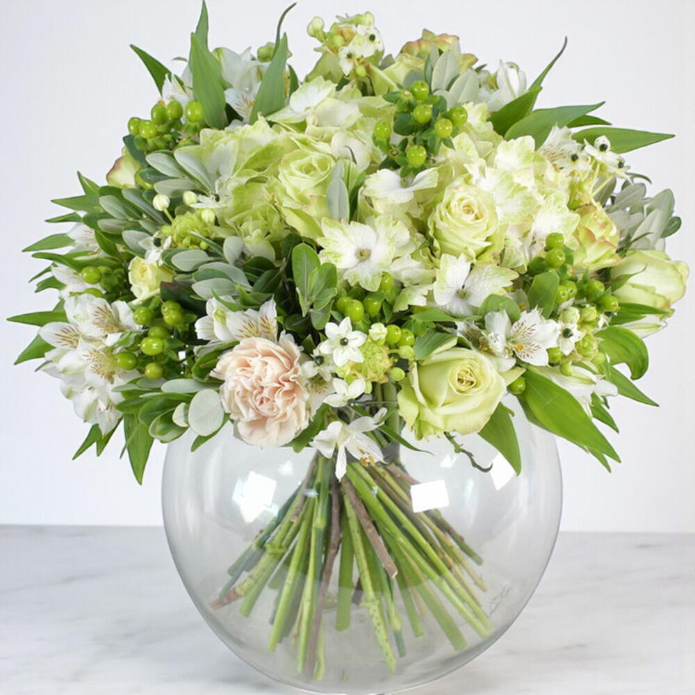 Вариация классического сочетания зелёного и белого цветов, этот букет одновременно элегантен и авангарден, изыскан и радикален. Белые альстромерии оттеняются кремовыми розами и дымчатыми гвоздиками, местами подчёркнутыми ягодами гиперикума и бликами серебристого эвкалипта.
