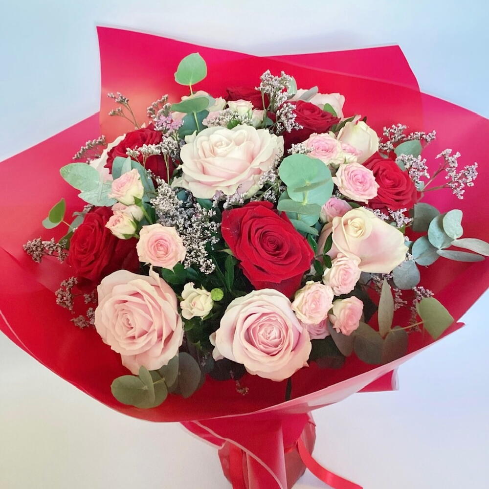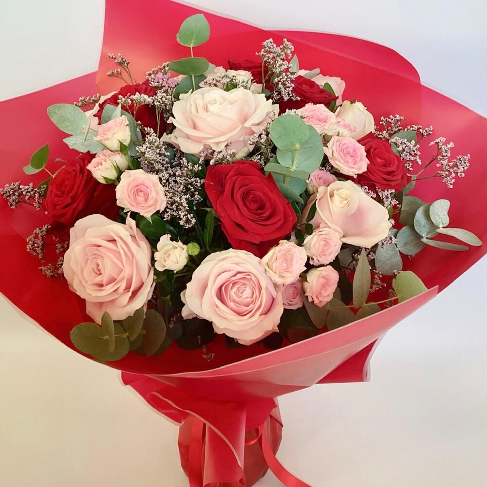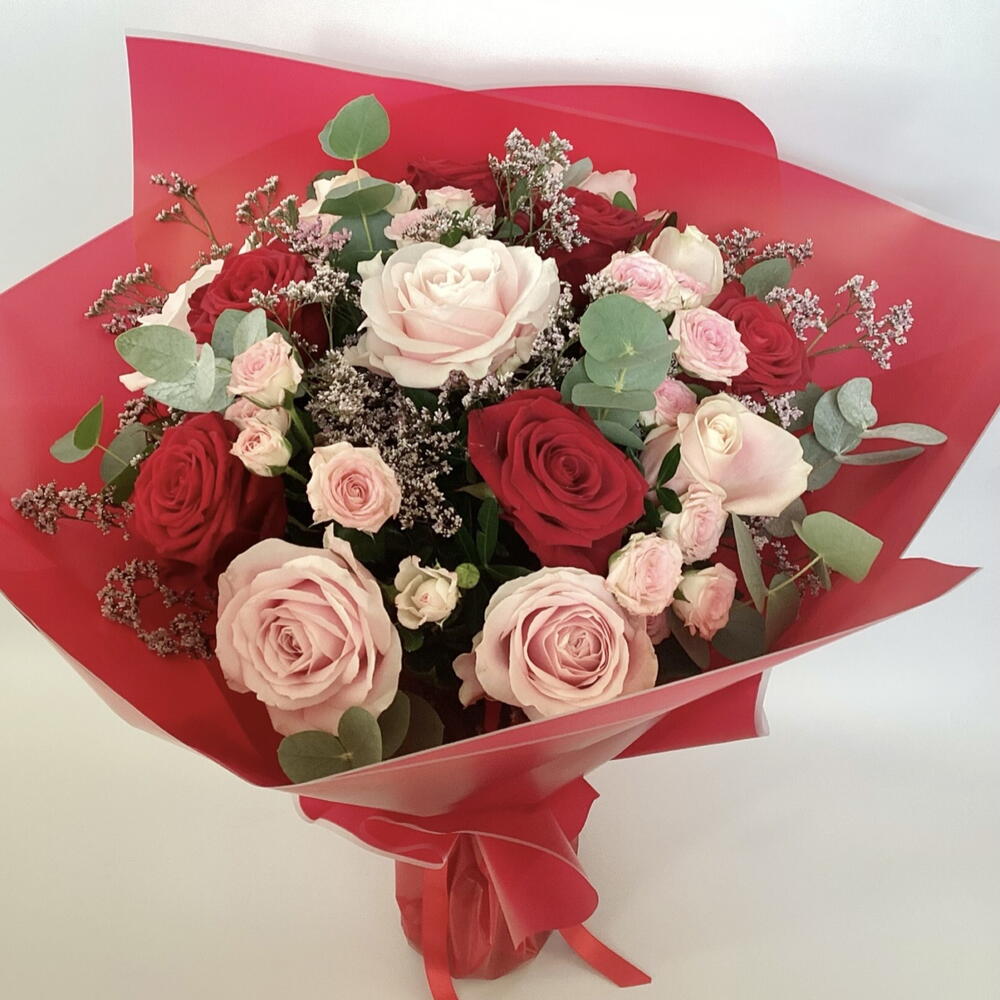 Страсть, сочетающаяся с грацией: яркие красные розы, нежно-розовые розы и нежные розовые спрей-розы, смешанные с небольшим количеством розового лимониума и в сочетании с мягким эвкалиптом, придают этому букету романтическое настроение.