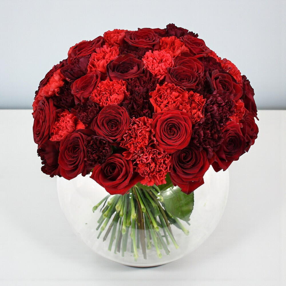 Роскошный и изысканный дизайн — это поистине романтический букет. Изобилие красных оттенков: наши флористы использовали премиальные розы Red Naomi и гвоздики двух оттенков, великолепно отобранные вручную.