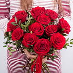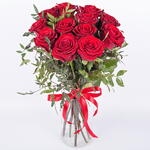 A charming bouquet composed of 12 exquisite roses in a rich, intense shade, complemented by fresh sprigs of greenery. This bouquet is a sincere expression of affection and will enhance any occasion. Share the warmth of your feelings with this beautiful arrangement.