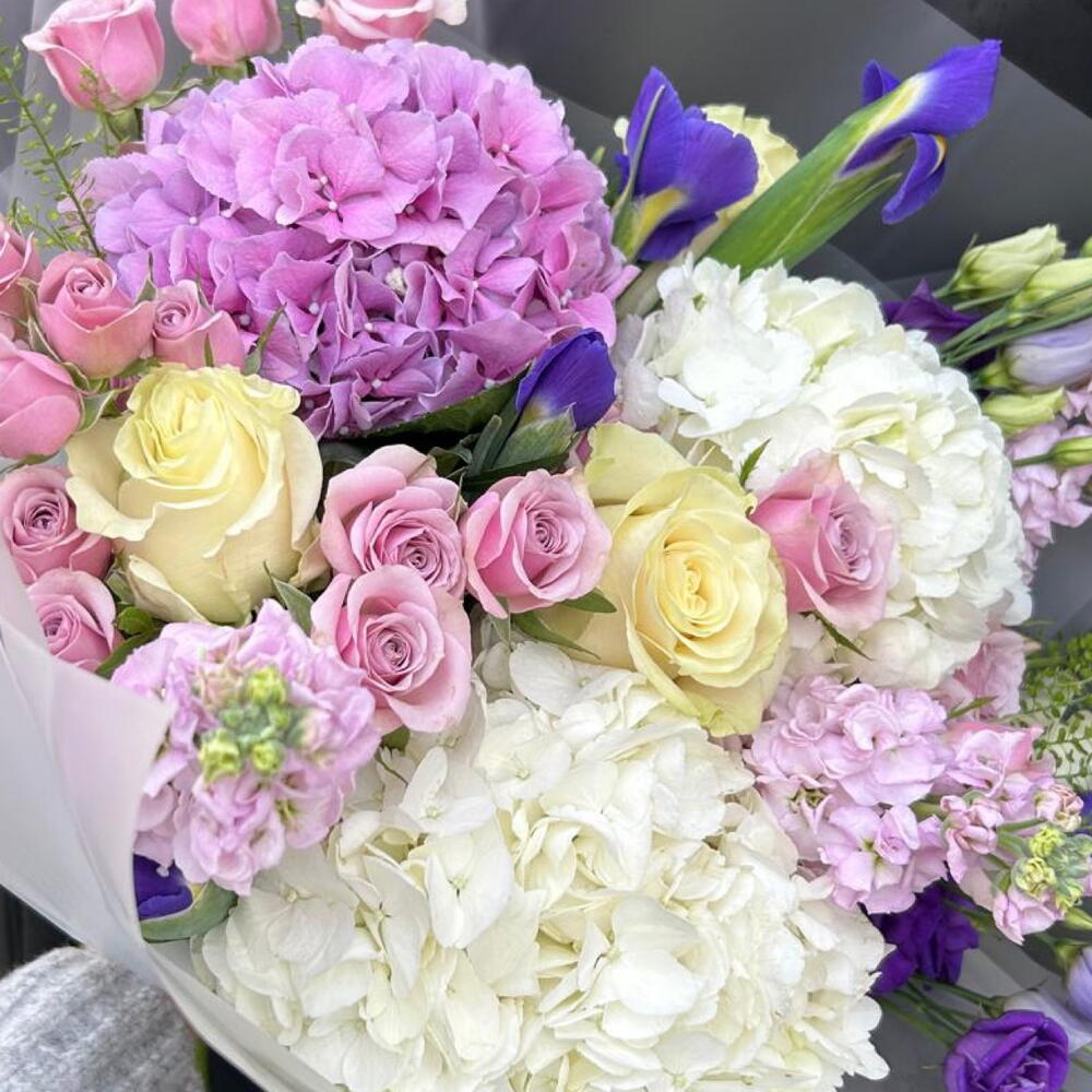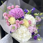 Clematis - 2 шт. White rose - 3 шт. pink spray rose - 3 шт. white hydrangea - 2 шт. lissi - 3 шт. purple hydrangea - 1 шт. matiola light purple - 3 шт.