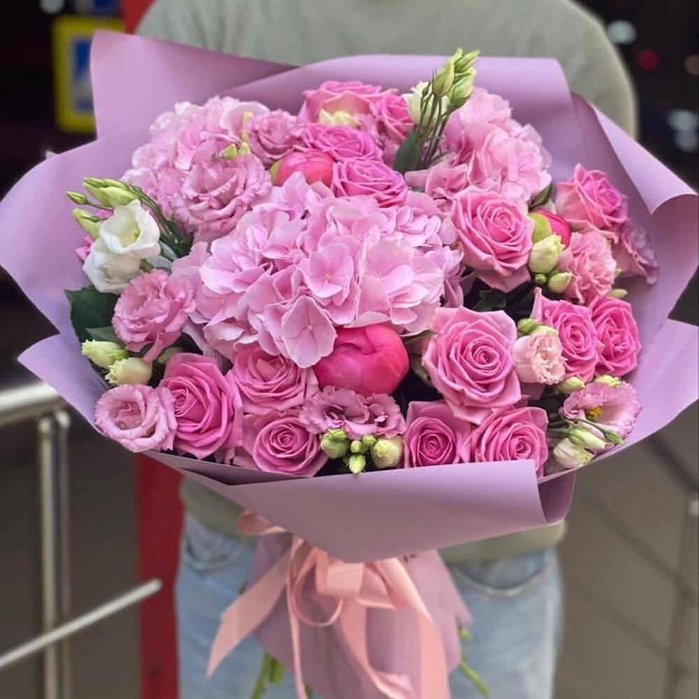 Все будут завидовать, когда они получат этот яркий букет! "Праздничный Сюрприз" - это красочная композиция с акварозами, розовыми лизиантусами, белыми лизиантусами, розовыми гортензиями и другими цветами. Сделайте их день ярче и праздничнее с этим прекрасным букетом.