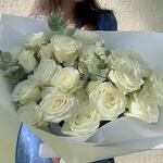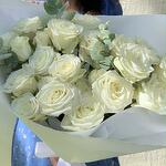 Букет из 6 стеблей белых спрей-роз с ароматным эвкалиптом в элегантной белой упаковке