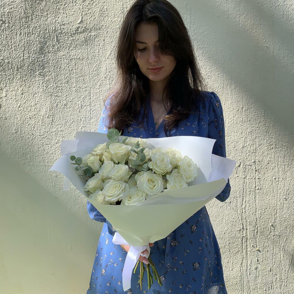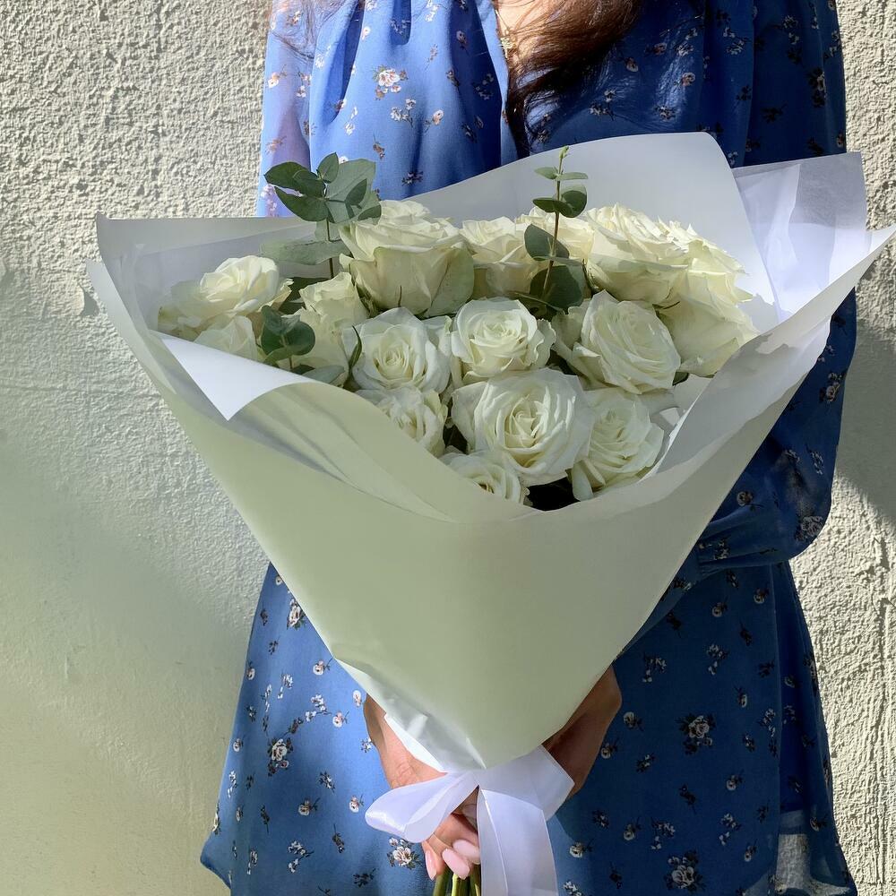 Букет из 6 стеблей белых спрей-роз с ароматным эвкалиптом в элегантной белой упаковке