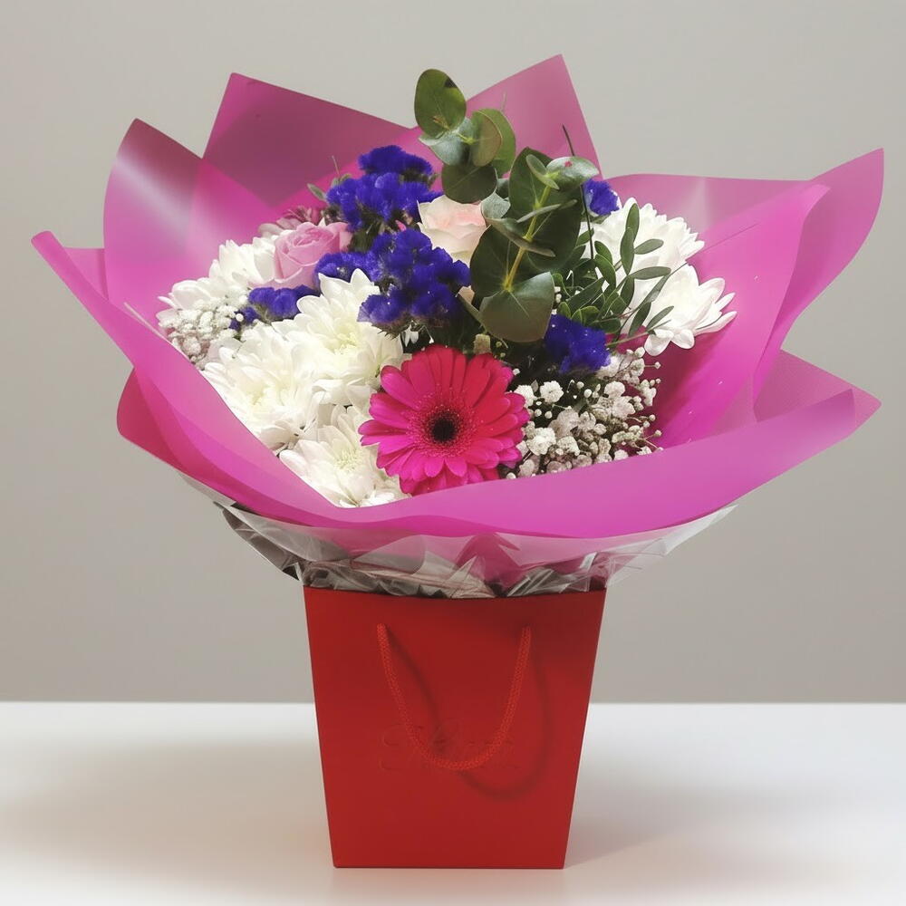 Этот очаровательный букет излучает свежесть со своей нежной смесью розовых гербер, белых хризантем, статицы и нежного гипсофила, дополненный касанием пышного эвкалипта. Нежные цвета и сочетание цветов делают эту композицию идеальным выбором, чтобы выразить привязанность, благодарность или просто поднять кому-то настроение. Будь то день рождения, особенный момент или просто так, этот букет подарит улыбку своим веселым и ярким видом. Нежный, цветочный аромат добавляет изысканности в любую комнату, делая его замечательным дополнением к любому дому или офисному пространству. Чтобы продлить свежесть вашего букета, поместите цветы в чистую вазу, наполненную свежей водой. Обновляйте воду каждые 2 дня и обрезайте стебли, чтобы они оставались увлажненными. Держите ваш букет подальше от прямых солнечных лучей и сквозняков, чтобы цветы оставались свежими как можно дольше. Цвета могут отличаться, и клиент может изменить выбор цветов на свой собственный.