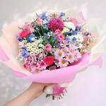 spray carnations - 5 шт. мини-хризантемы - 3 шт. стебли розовых хризантем - 3 шт. стебель розовой гвоздики - 3 шт. стебель розовой лилии - 3 шт. стебель розовой розы - 6 шт.