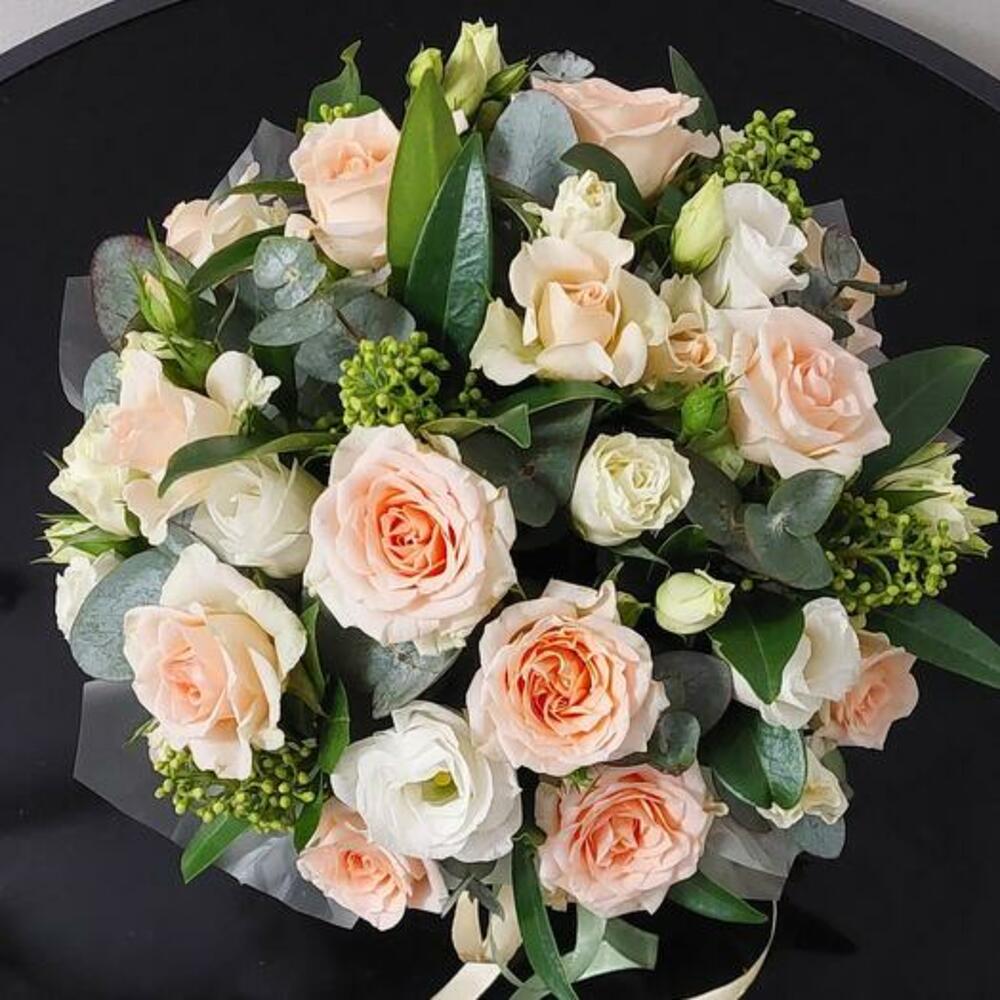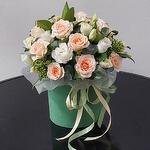 Satin ribbon - 2 шт. Eustoma - 2 шт. packaging - 1 шт. skimmia - 5 шт. eucalyptus baby blue - 4 шт. bush rose - 5 шт. шляпная коробка - 1 шт. цветочный оазис - 1 шт.