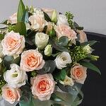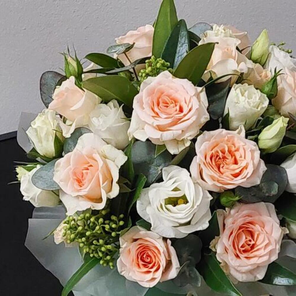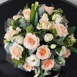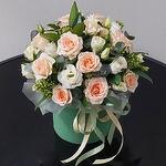 Цветы в коробке. Кустовые розы, эустома и скиммия в шляпной коробке.