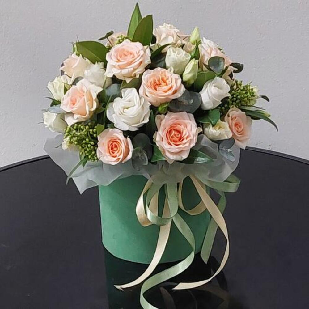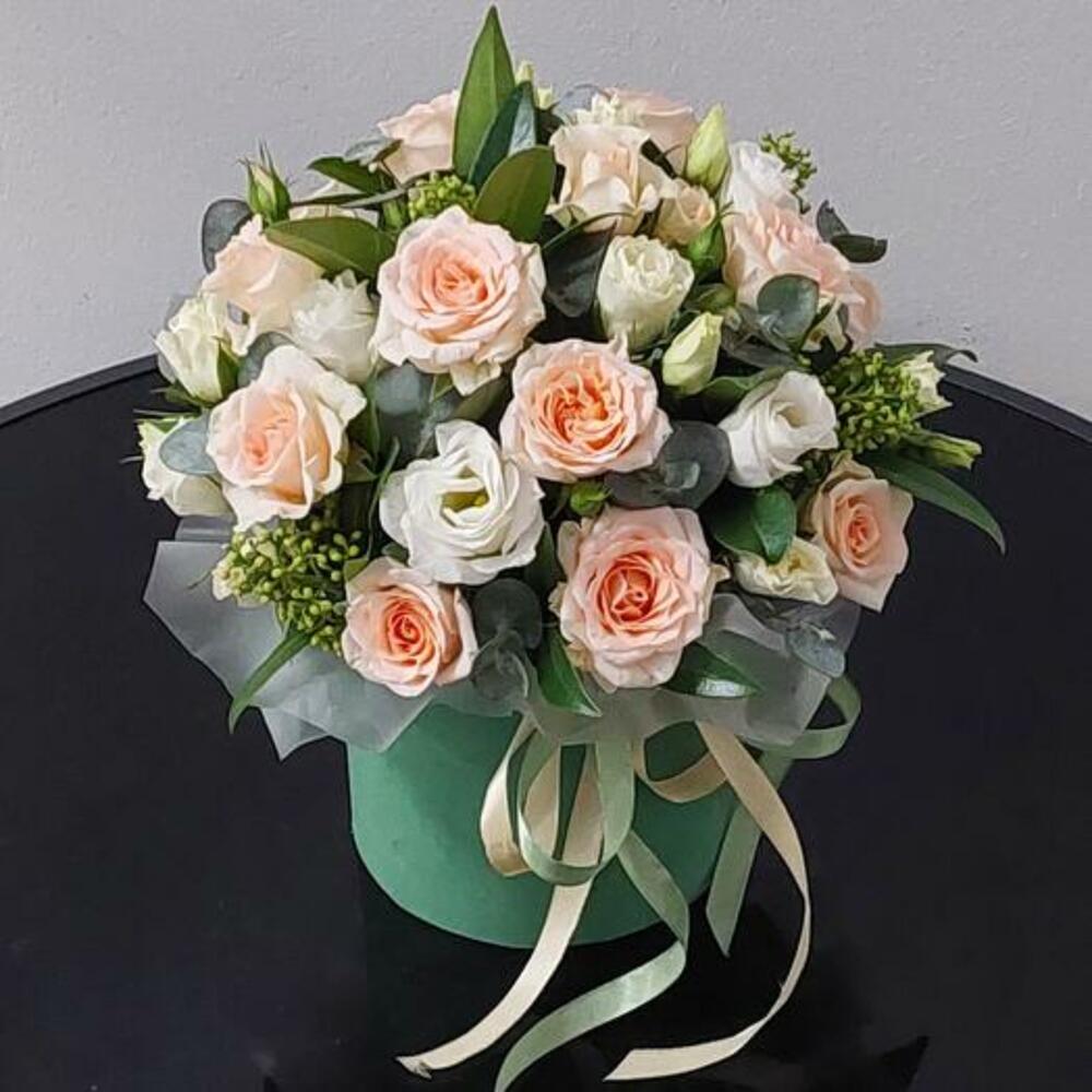 Романтическая композиция из кустовых роз, эустомы, скиммии и эвкалипта в шляпной коробке.