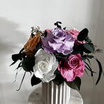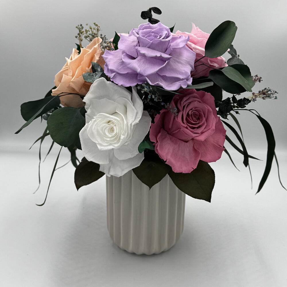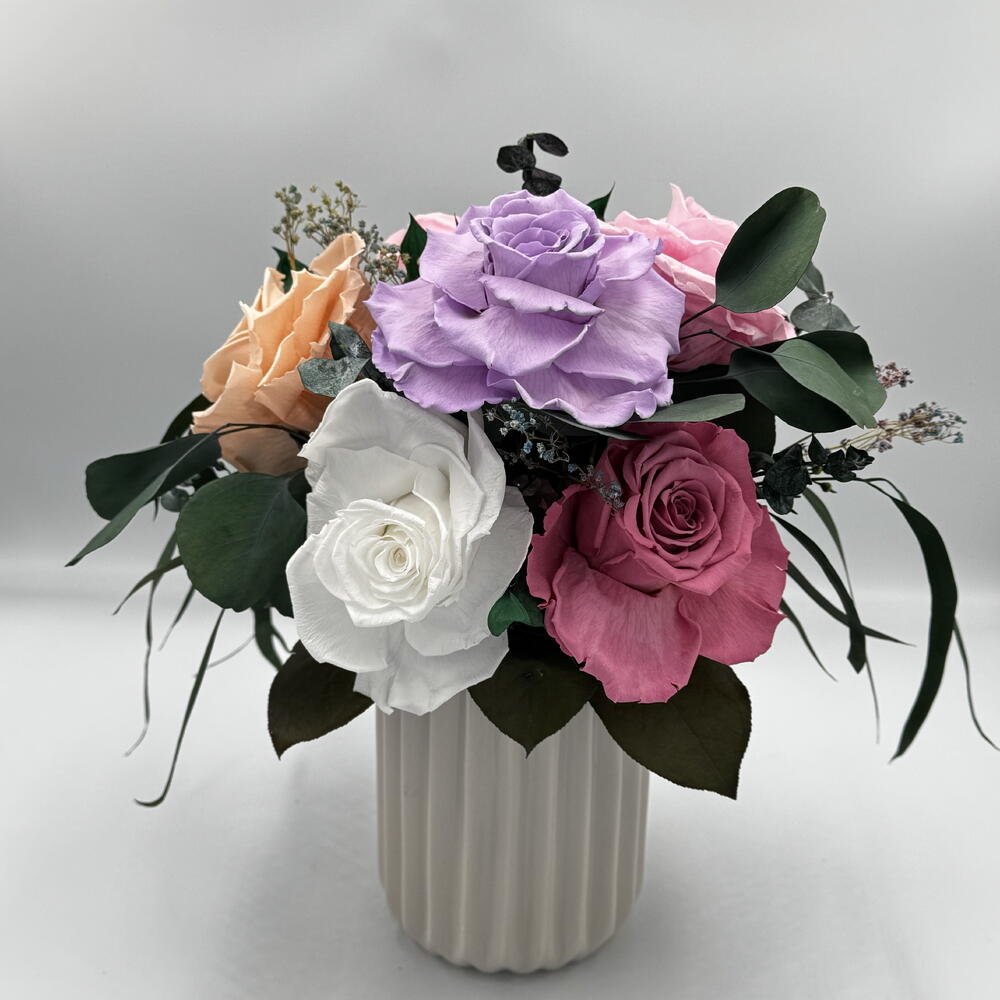 Композиция из цветов разных цветов, которые никогда не увядают, в белой керамической вазе - это великолепный и элегантный элемент, который добавляет теплоту и изысканность в любую комнату. Уход не требуется