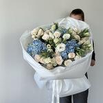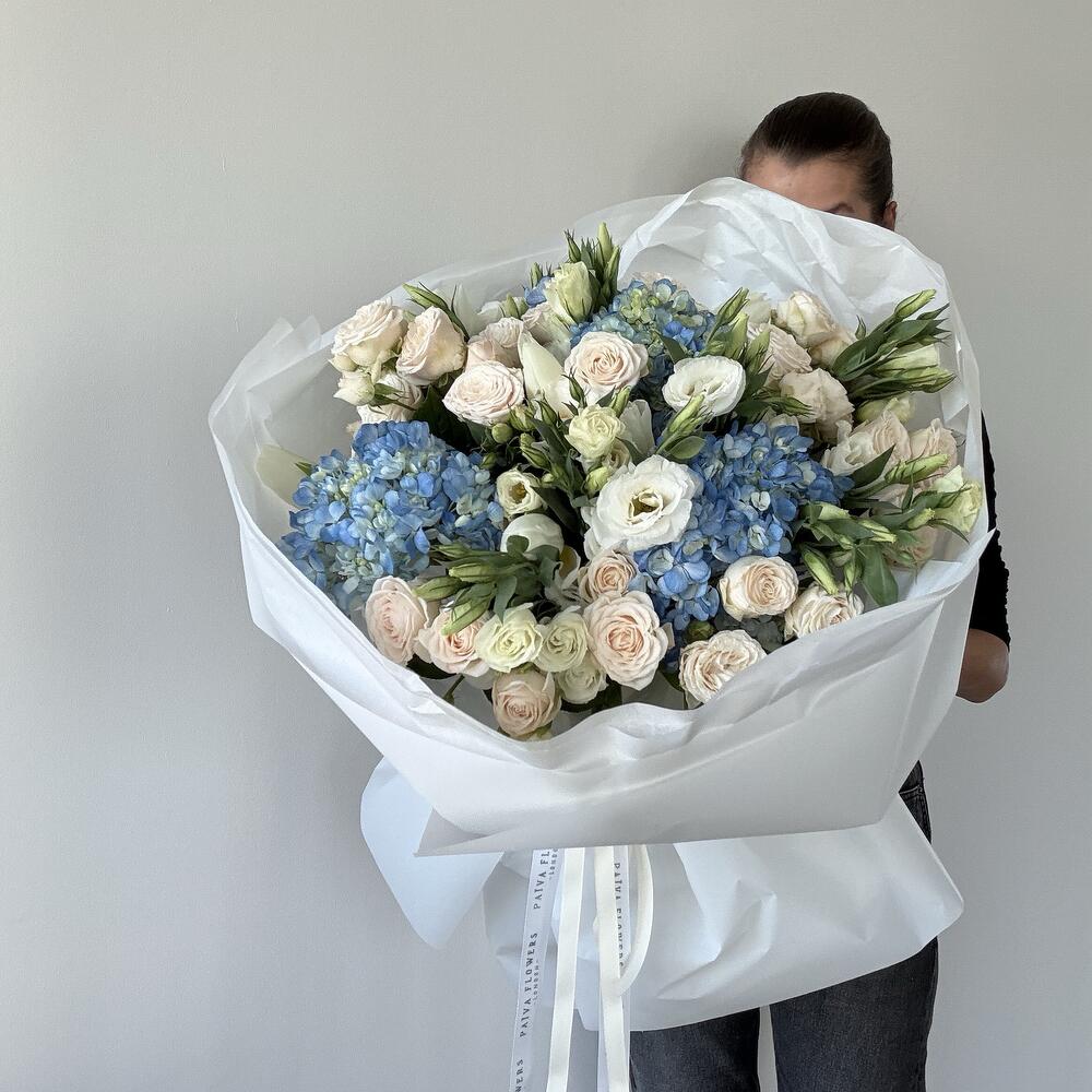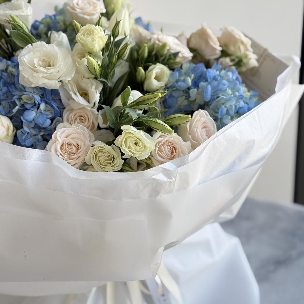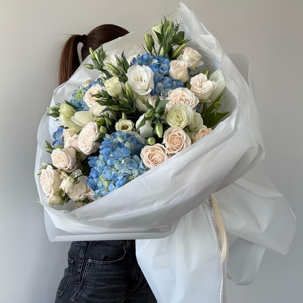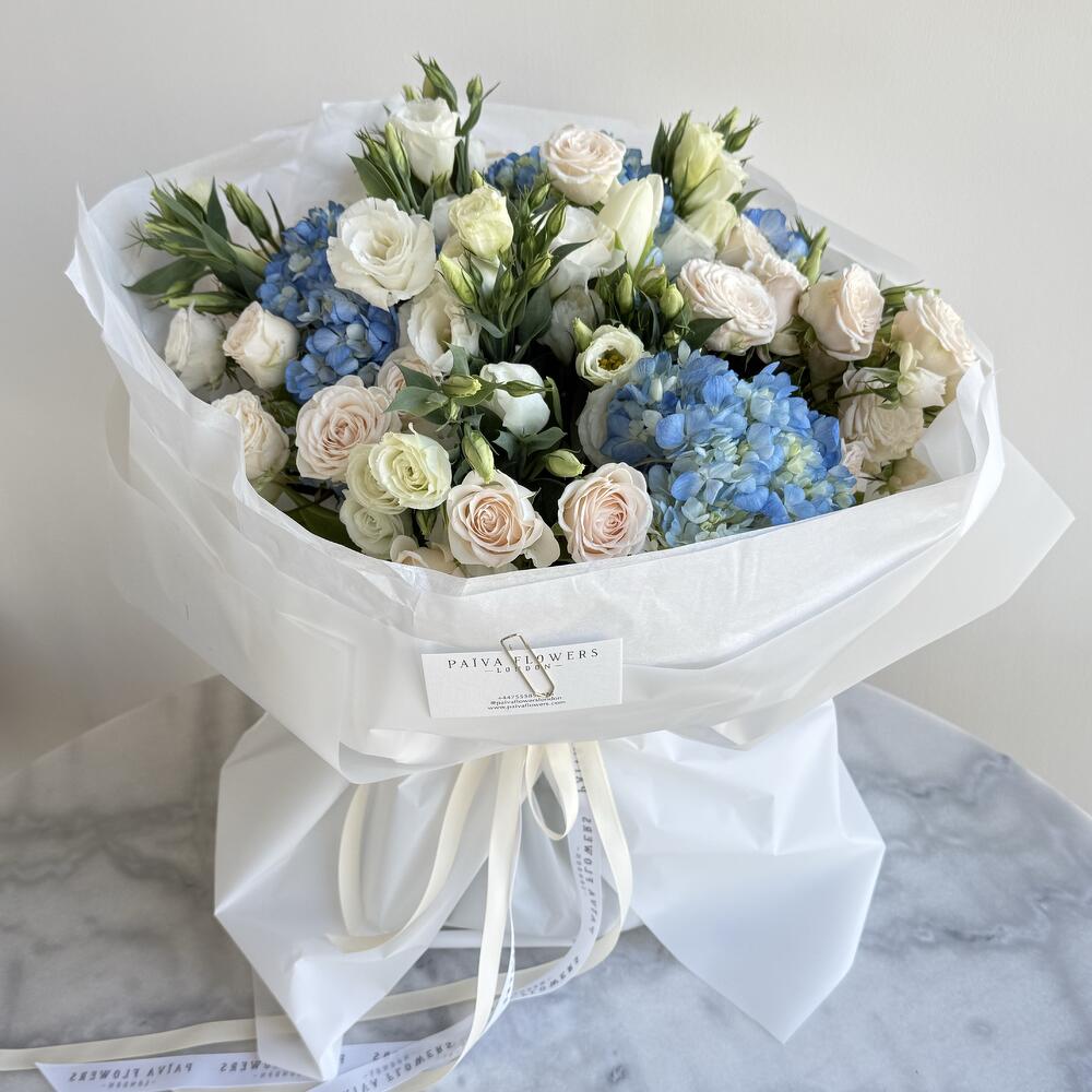Luxury bouquet with hydrangeas, roses and seasonal premium flowers. Elegant arrangement in soft blue and cream tones. Perfect for birthdays, congratulations and special occasions. Handcrafted by professional florists. Same-day delivery available in London.
