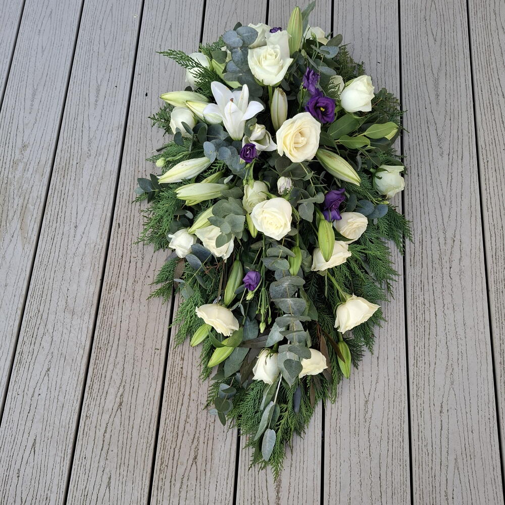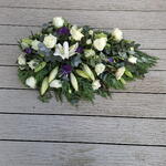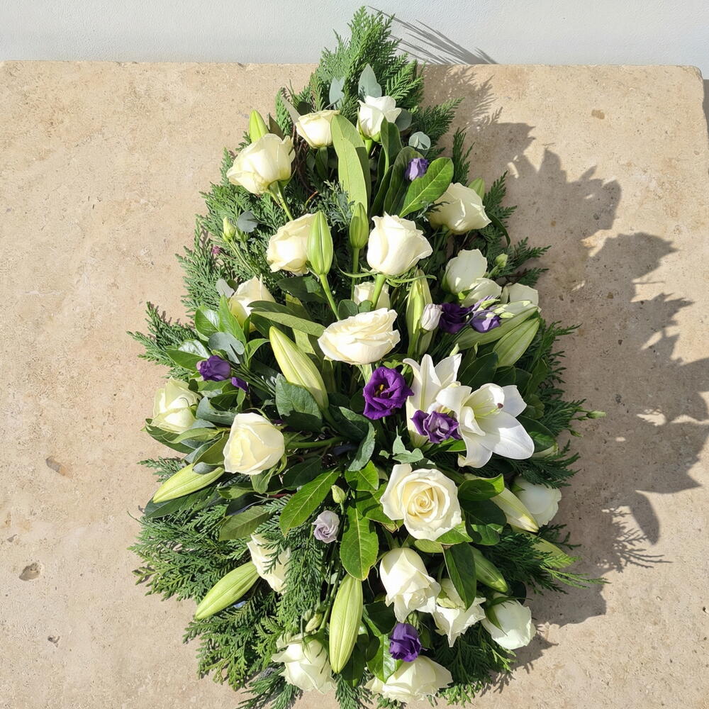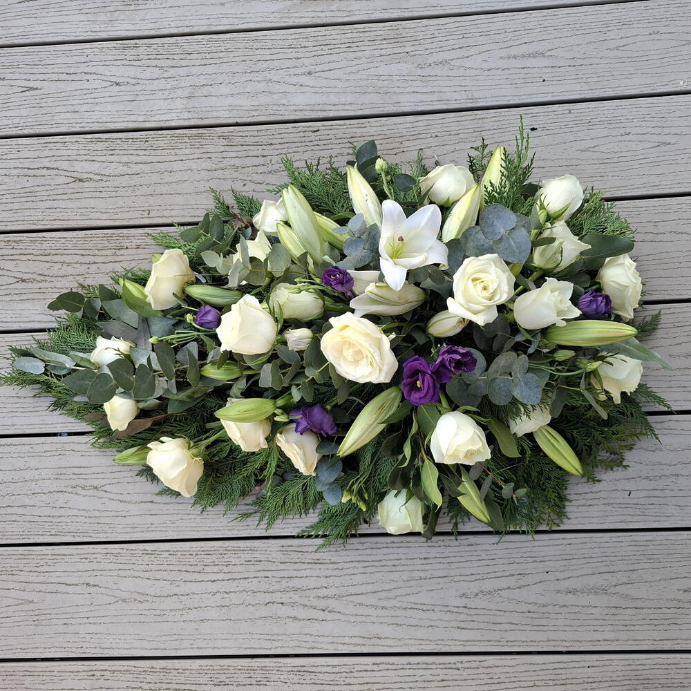 Погрузитесь в изящество и грацию этой изысканной односторонней похоронной цветочной композиции. Созданная с гармоничным сочетанием шести безупречных белых лилий, пяти акцентов пурпурного/сиреневого лизиантуса и впечатляющей окантовки из 25 белых/кремовых роз, она передаёт спокойствие и уважение. Семь листьев эвкалипта переплетаются с разнообразной смесью из 15 элементов листвы, подчёркивая многослойную текстуру композиции. В её основе — флористическая пена, располагающая каждый цветок и лист на своём идеальном месте, делая композицию подходящим способом выразить соболезнования.