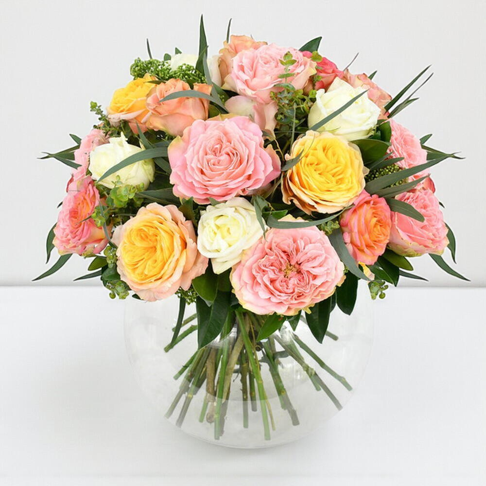 Великолепный подбор наших любимых садовых роз, аккуратно связанных вручную со свежей скиммией и сезонной листвой. Непринужденный и изысканный букет, наши восхитительные садовые розы получают пространство, чтобы блистать, распускаясь в волнистом совершенстве на фоне ненавязчивой, стильной зелени.