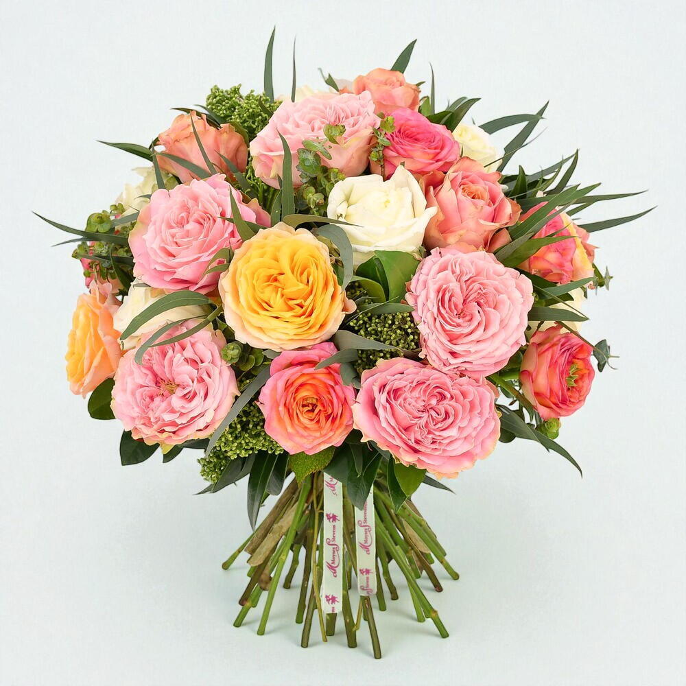 Великолепный выбор наших любимых садовых роз, вручную перевязанных свежей скиммией и сезонной зеленью. В этом непринужденном и изысканном букете наши изысканные садовые розы раскрываются во всей красе, раскрываясь в изысканной фактуре на фоне нежных, стильных оттенков зелени.
