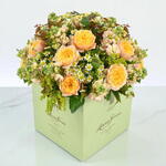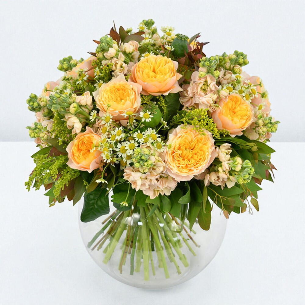 Яркие летние оттенки уже в пути — надеемся, они будут соответствовать предстоящему лету! Golden Vuvuzela — одна из наших любимых роз, поэтому неудивительно, что она снова появилась в ещё одном нашем букете. Её раскрытый цветок говорит о том, что она полностью в цвету и в своём расцвете на протяжении всего срока жизни. Её персиково-нежные лепестки прекрасно сочетаются с ярко-жёлтым золотарником и тонко ароматной кремовой маттиолой, создавая по-настоящему золотой букет!