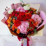 Red rose - 9 шт. orange spray rose - 9 шт. red hypericum - 5 шт. red spray rose - 7 шт. pink hydrangea - 3 шт. букет эвкалипта - 1 шт.