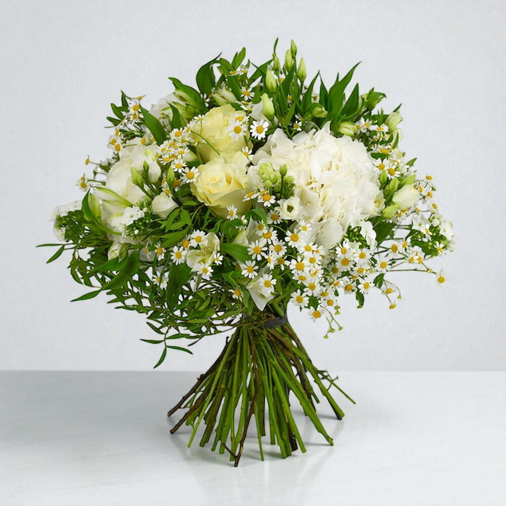 Всегда стоит напоминать себе о зелёных лугах весны. Здесь, в Moyses, весна — наше любимое время года, и этот букет — своего рода дань сезону. С ромашками, белыми лизиантусами, белыми розами, гортензиями и калиной, он представляет собой изобилие зелёных оттенков и мягких белых тонов.