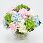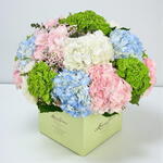 Удивительное сочетание розовых, белых, зелёных и голубых гортензий. Это пышный букет, связанный вручную, который гарантированно красиво украсит любой дом. Обратите внимание, что гортензии меняют цвет с изменением сезонов.