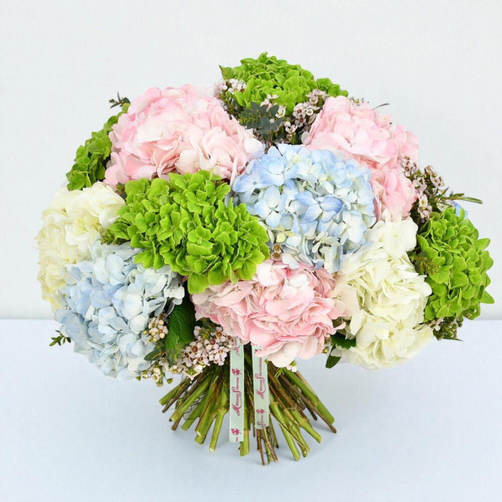 Потрясающая смесь розовых, белых, зелёных и голубых гортензий. Это пышный букет, связанный вручную, который гарантированно красиво украсит любой дом. Пожалуйста, имейте в виду, что гортензии меняют цвет в зависимости от сезона.