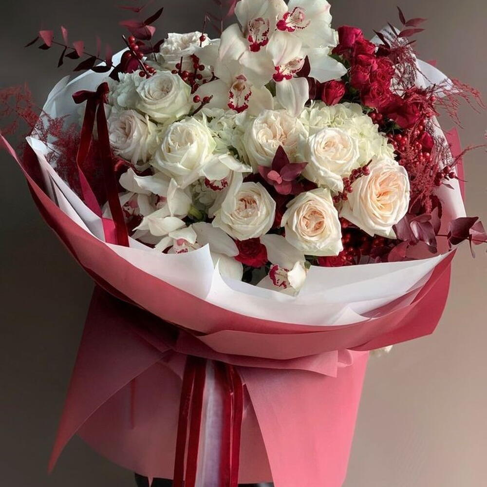 Роскошное сочетание белых роз, гортензий и орхидей фаленопсис, подчеркнутое смелыми штрихами красного аспарагуса, эвкалипта и спрей-роз. Элегантный, современный и идеально сбалансированный, этот букет является утончённым выражением контраста и роскоши, эксклюзивно от Bosii’s Flowers.