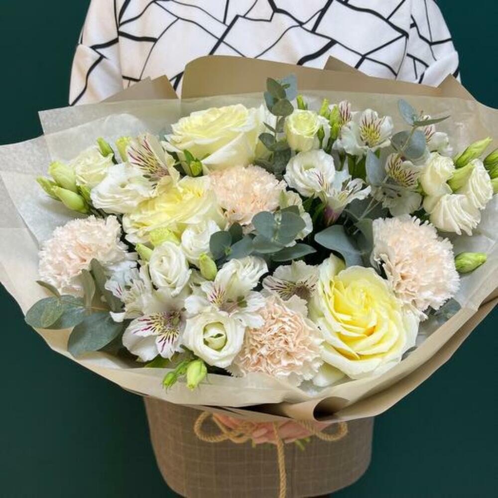 Отдайтесь элегантности нашего букета "Слоновая Кость Мечты", в который входит изысканное сочетание белых роз, гвоздик и альстромерий. Этот букет излучает изысканность и грацию, делая его идеальным выбором для любого особенного случая. Мастерски оформленный и красиво упакованный, букет "Слоновая Кость Мечты" создан, чтобы впечатлять и радовать. Будь то празднование важного события, выражение благодарности или просто добавление красоты в ваш дом, этот букет является идеальным выбором.
