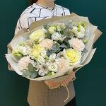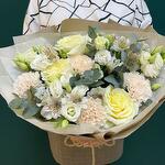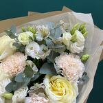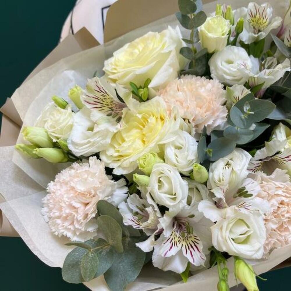 Eucalyptus - 5 шт. white alstroemeria - 3 шт. white lisianthus - 3 шт. сливочный гвоздика - 3 шт. kraft wrapping - 1 шт. сливочно-пионовая роза - 3 шт. кремовая тишью-бумага - 2 шт. верёвка - 1 шт.