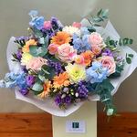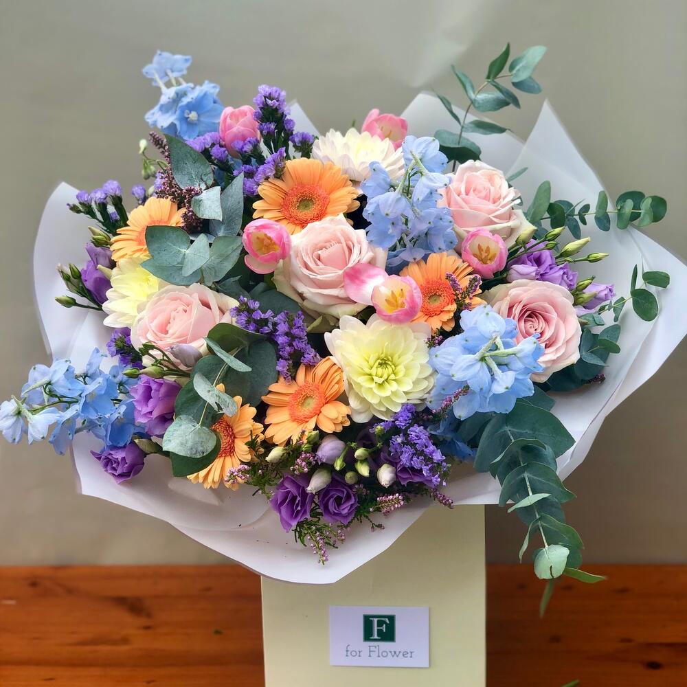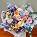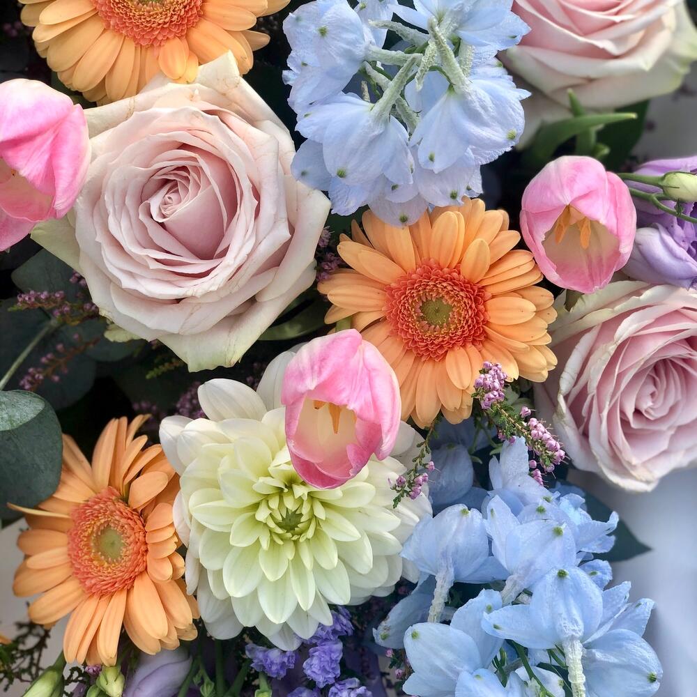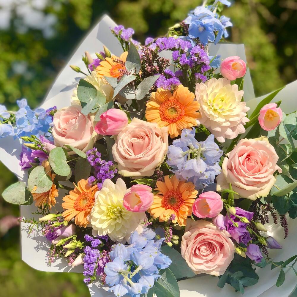 ~ Этот цветочный букет представляет собой смесь сладких розовых роз, герберы, белой хризантемы, голубого дельфиниума, лизиантуса, фиолетовой статицы, розовых тюльпанов, фиолетового вереска и эвкалипта. ~ Немного времени для рассказа: Значения дельфиниума включают открытость, новые впечатления и общий позитив. Эти красивые голубые цветы вызывают чувство радости, тепла и веселья. Дельфиниумы - идеальный цветок для подарка тому, кто, возможно, чувствует себя подавленным в жизни, и для того, чтобы побудить его расширить свой кругозор и попробовать что-то новое. ~ Пожалуйста, не стесняйтесь обращаться к нам, если вам нужны какие-либо изменения в наших букетах, касающиеся добавления или вычитания. Мы всегда более чем рады выслушать ваши мысли и помочь вам создать цветочную композицию вашей мечты. В случае возникновения каких-либо проблем с качеством или поставками мы оставляем за собой право заменить один или несколько стеблей эквивалентными или более ценными, качественными и, конечно же, похожими по цвету цветами.