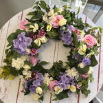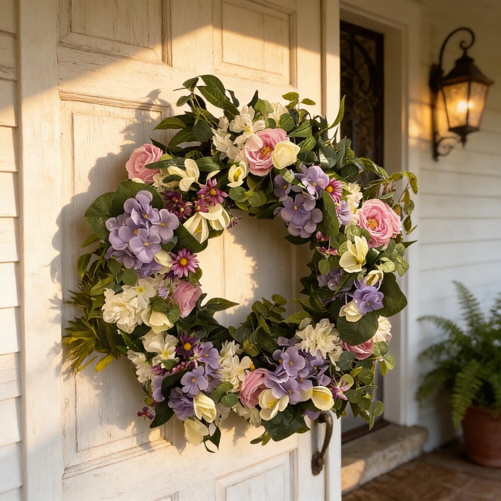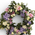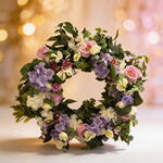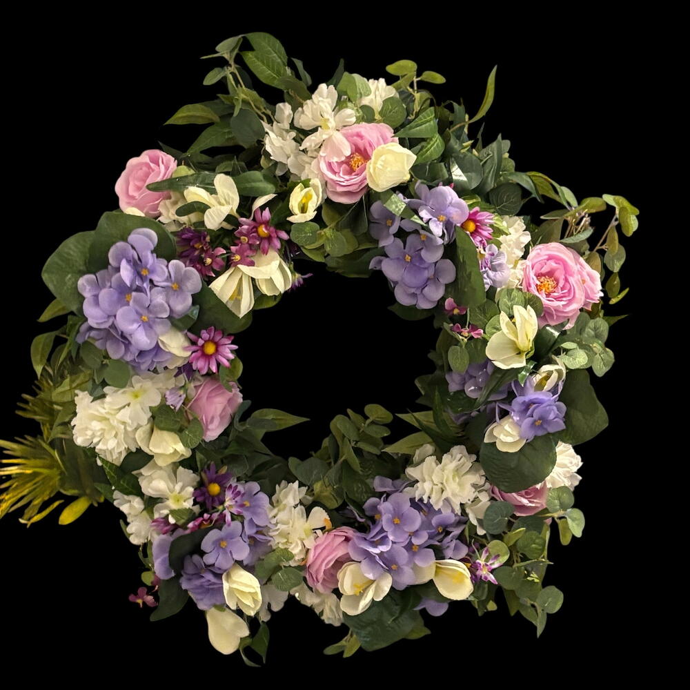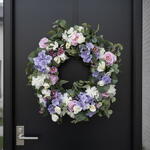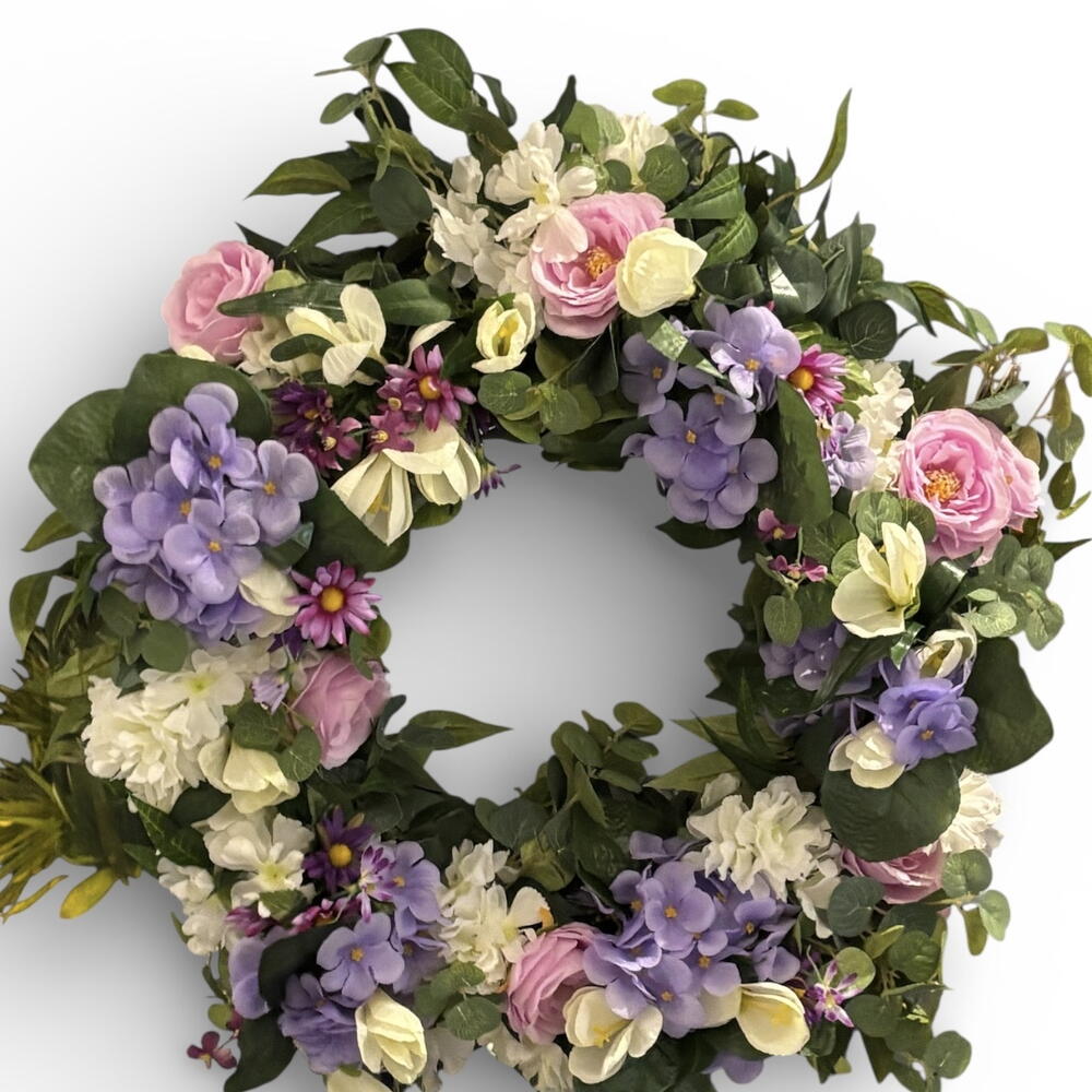 Прекрасно выполненный венок ручной работы на натуральном неочищенном ивовом кольце, украшенный слоями пышной зелени рускуса и нежной листвы. Нежно-розовые розы плавно сочетаются с деликатными цветками, кремовыми крокусами, фиолетовой кустовой лавандой и пурпурными маргаритками, создавая романтическую палитру оттенков лаванды, слоновой кости и розового для элегантного сезонного акцента. Диаметр 54 см