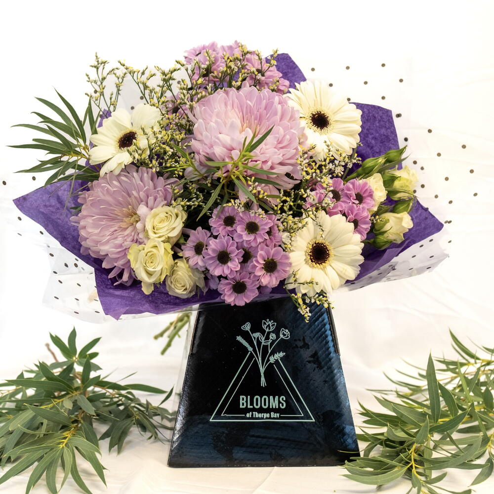 Ощутите изысканную элегантность этой цветочной композиции с сиреневыми соцветиями, белыми спрей-розами, лимониумом, хризантемами сантини и гермини. Собранная вручную для гармонии и красоты, она приносит мягкую, успокаивающую нотку в любую обстановку — идеально как для праздников, так и в знак внимания.