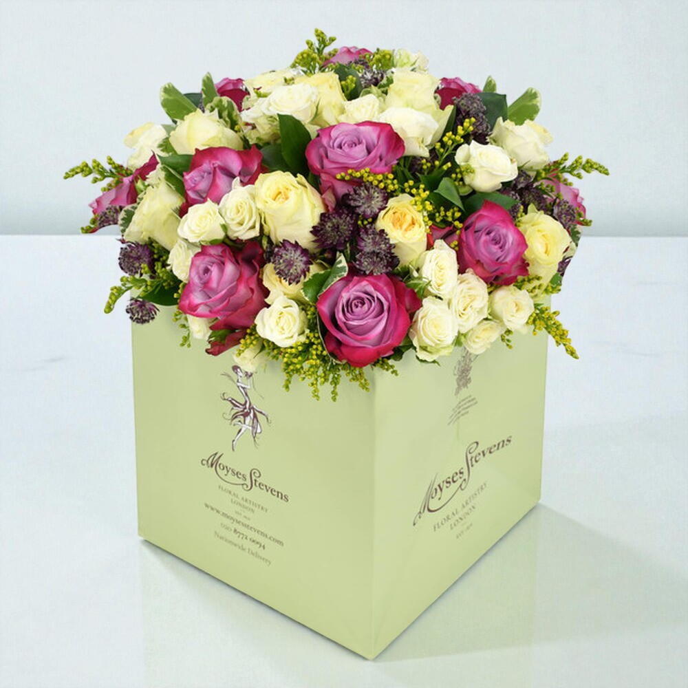 Тема этой недели – нежные и мягкие жёлтые тона! Они идеально сочетаются с золотистыми лучами, которые мы увидим в ближайшие дни. Нежные и пастельные розы сорта «лютик» в сочетании с белыми кустовыми розами и жёлтым солидаго придают этой композиции золотистые оттенки. Они прекрасно контрастируют с яркими цветовыми акцентами наших двухцветных фиолетовых роз и изящной астранции.