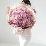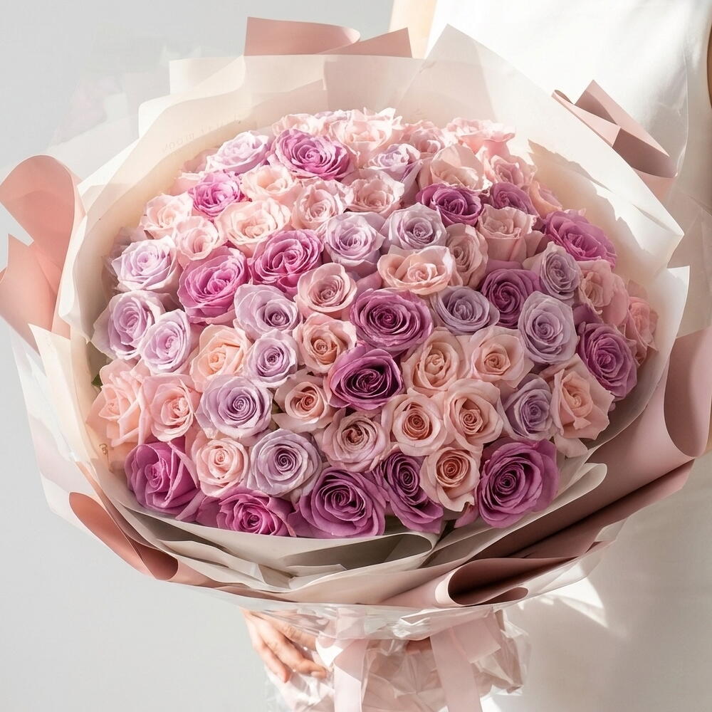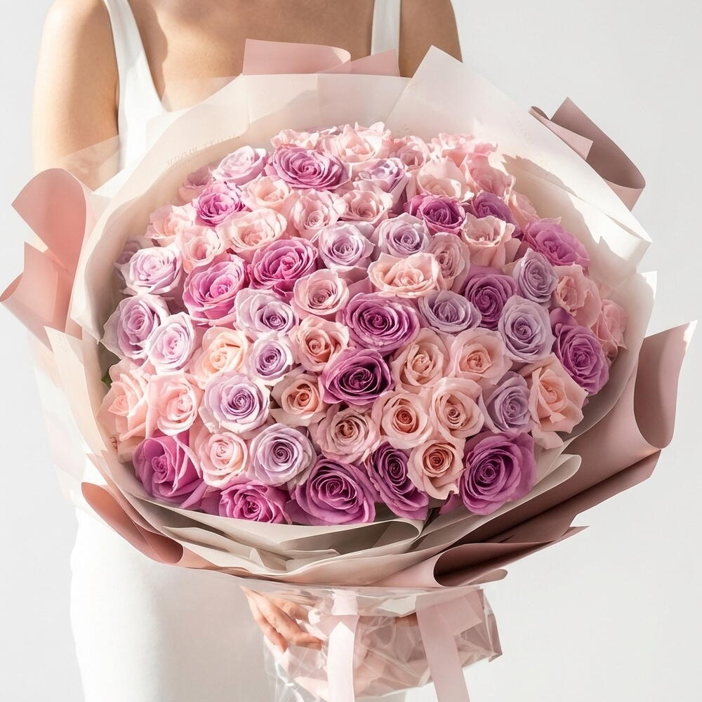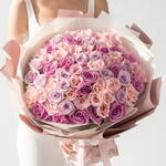 мягкие розовые розы - 25 шт. премиальные сиреневые розы - 25 шт.