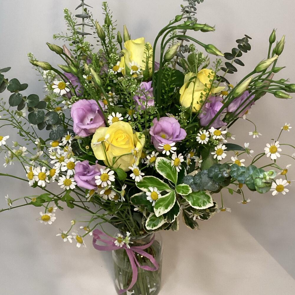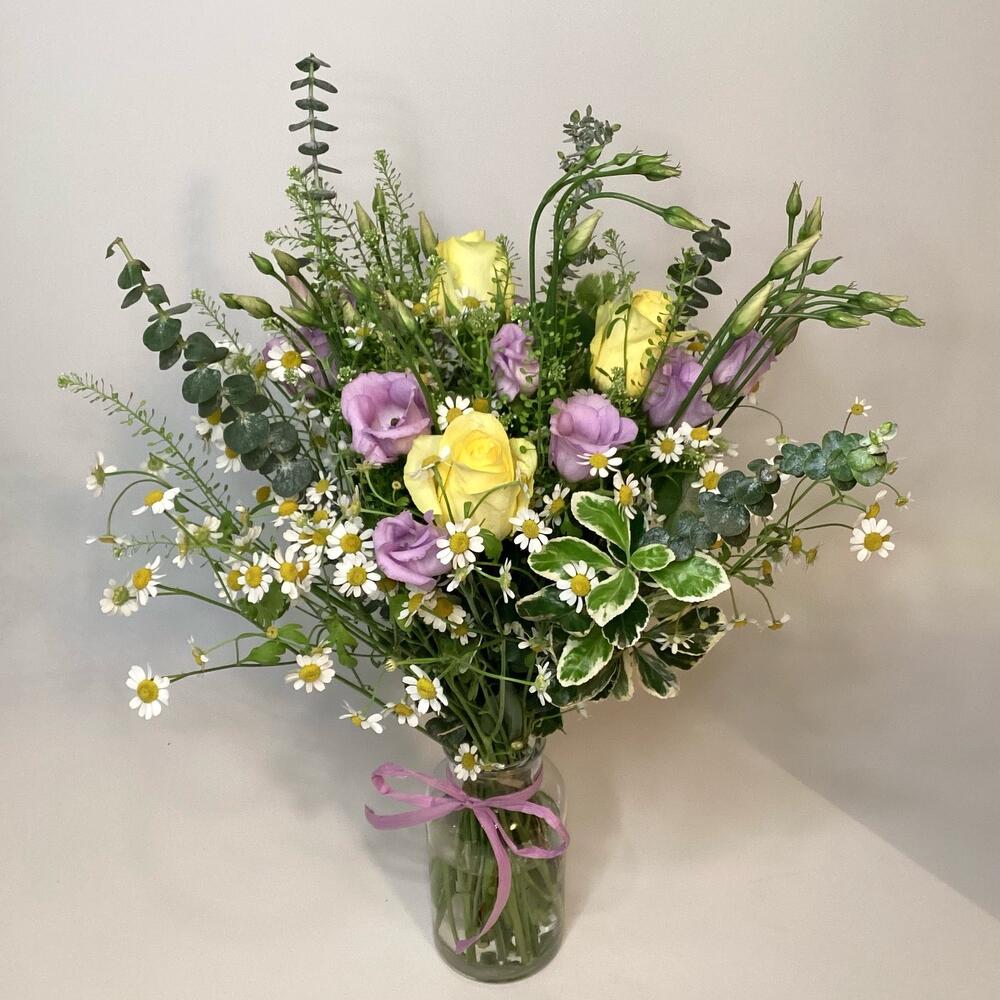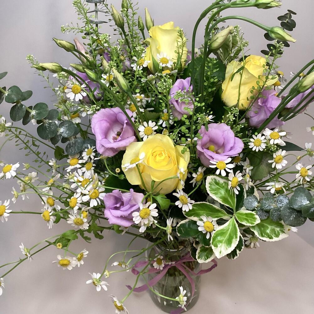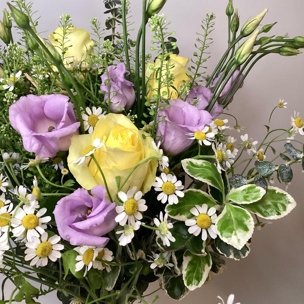 Свежий вид цветочной композиции в вазе, создающей атмосферу весны или лета. Включает желтые розы, лавандовые лизиантусы и ромашки с добавлением зелени. Ваза включена, высотой от 16 до 20 см.