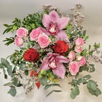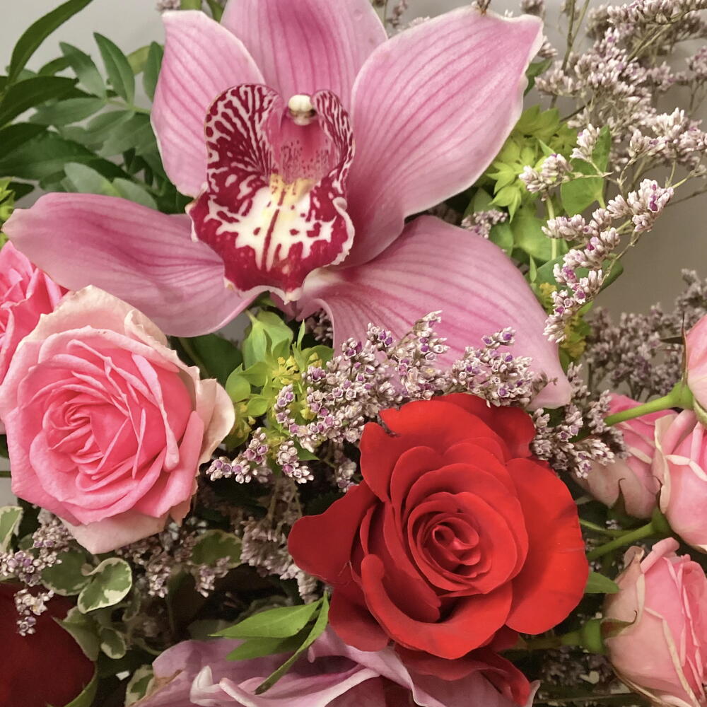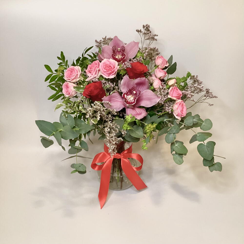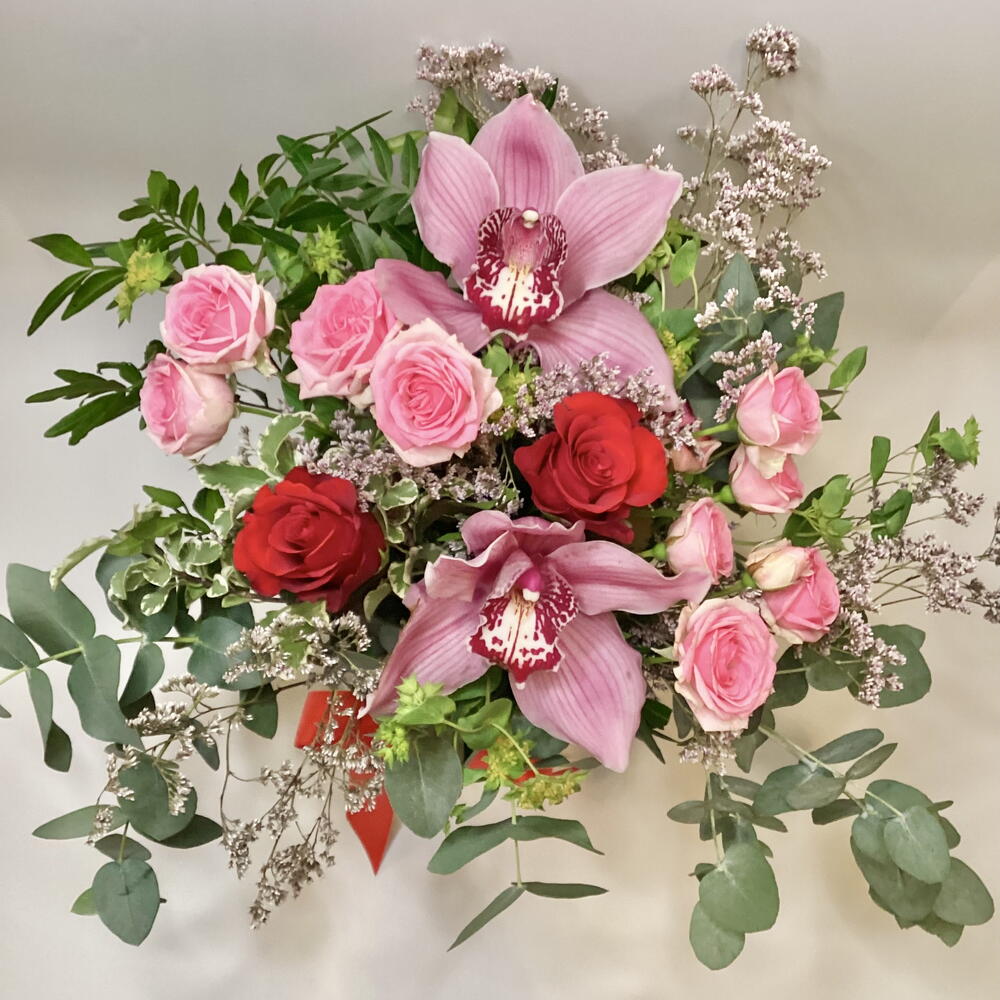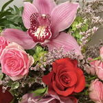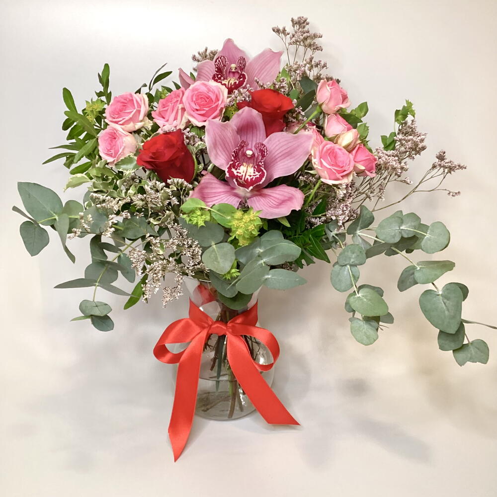 Композиция в вазе из красных роз, розовых бутонных роз, головок цимбидиума, лимониума, буплерума и смеси листвы. В комплект входит прозрачная стеклянная ваза высотой 18 см.