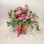 Red rose - 2 шт. Eucalyptus - 3 шт. Pistacia - 3 шт. pittosporum - 2 шт. лимониум розовый - 3 шт. буплерум - 2 шт. букет роз в брызгах - 2 шт. головки орхидеи цимбидиум розовые - 2 шт.