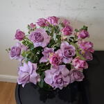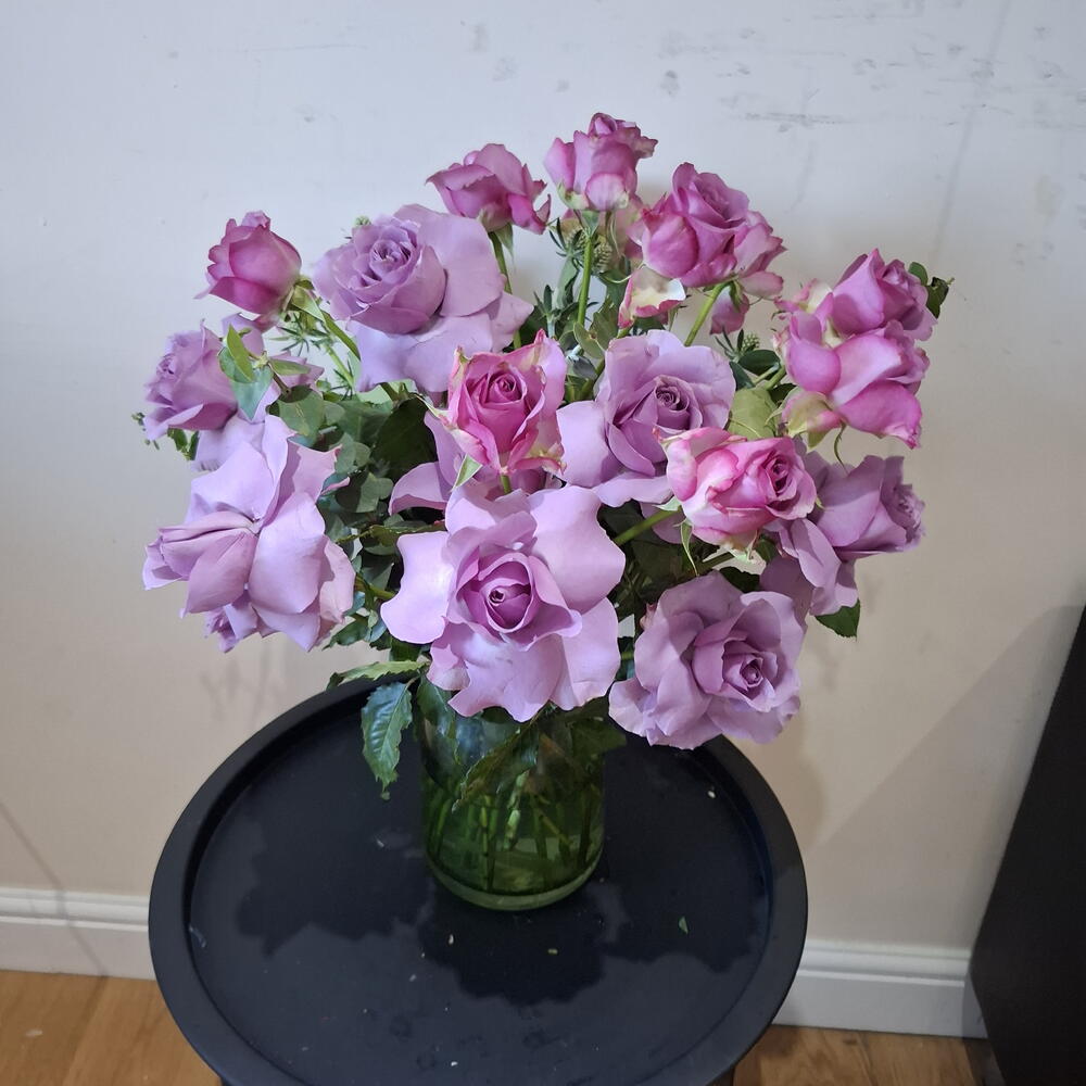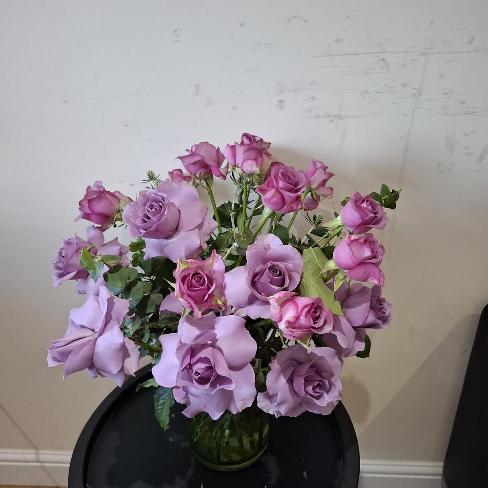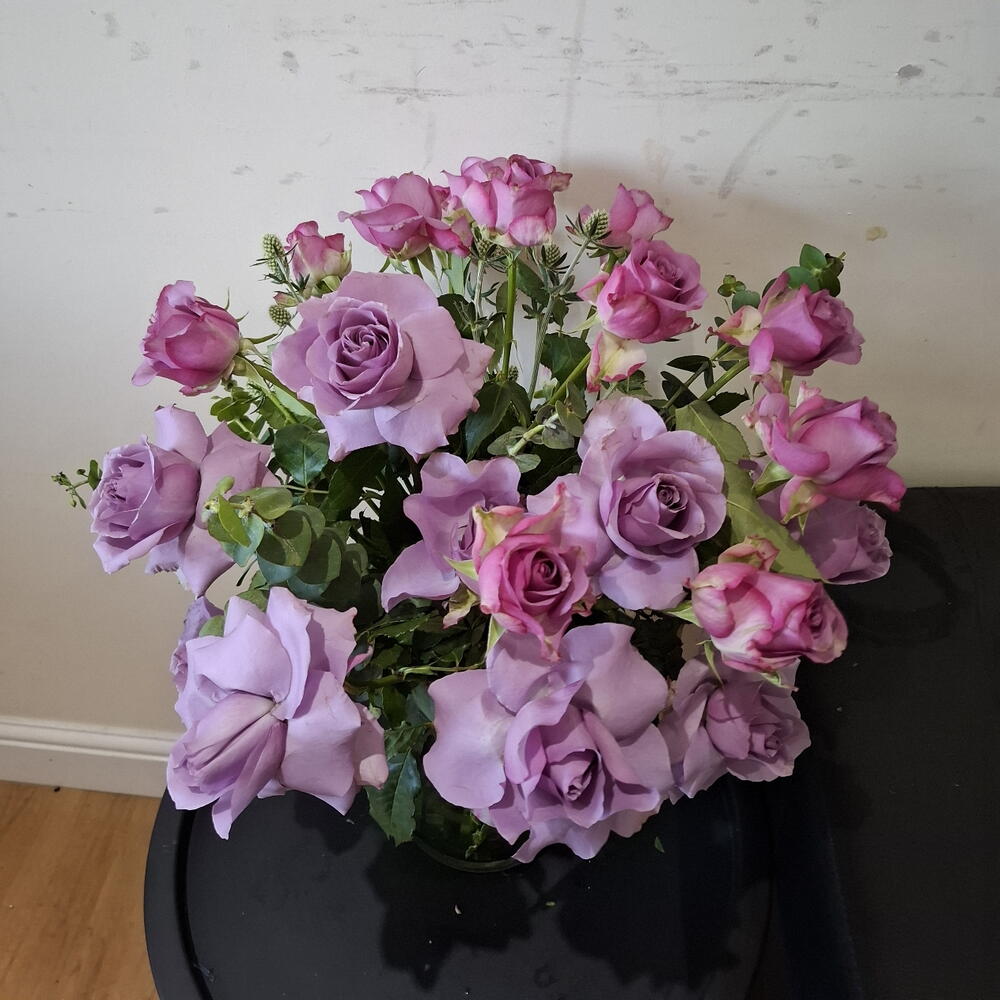Потрясающая композиция в вазе из сирени и роз, идеально подходящая в качестве подарка, для дома или офиса. Флорист тщательно обрабатывает каждую сиреневую розу, придавая ей объем и подчеркивая красоту. Для большей пышности добавлены розовые розы. 18 роз эффектно выделяются на фоне красивых листьев эвкалипта, эрингиума или других подобных растений, создавая текстуру и контраст. Ваза поставляется со стеклянной водой или раствором для увлажнения, поэтому композиция уже увлажнена и выглядит презентабельно. Вам потребуется лишь доливать воду и менять ее каждые 2-3 дня, а также обрезать 1 см у основания стеблей, чтобы композиция дольше сохраняла свежесть. В сезон мы можем добавить пионы.