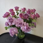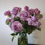 Pink rose - 7 шт. lilac rose - 9 шт. ветки эвкалипта - 7 шт. стеклянная ваза - 1 шт. выбор флориста: зелень/наполнитель - 5 шт.