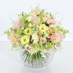 Нежные белые, нежно-розовые и кремовые оттенки — одно из наших любимых сочетаний. Это изысканное сочетание прекрасно сочетается, создавая эту пышную и потрясающую композицию. В ней собраны многочисленные розы: от кустовых до садовых и нежно-розовых с крупными бутонами. Эта композиция полна жизни, радости и красоты, идеальный подарок для любимого человека, воплощающего эти слова.