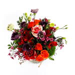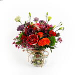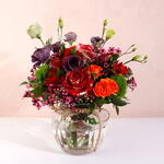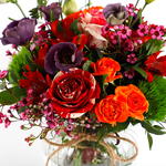 Этот яркий букет — потрясающая смесь цветов и текстур: оранжевые розы, фиолетовый лизиантус и нежные розовые восковые цветы в сочетании с разнообразной пышной зеленью. Насыщенные оранжевые и фиолетовые тона красиво контрастируют с мягкими розовыми акцентами, создавая живую, но гармоничную композицию. Идеально подходит для любого случая, этот букет излучает тепло и энергию, становясь продуманным подарком, который поднимет настроение каждому. Профессионально оформленный в очаровательной стеклянной вазе, этот цветочный шедевр наверняка произведёт неизгладимое впечатление.