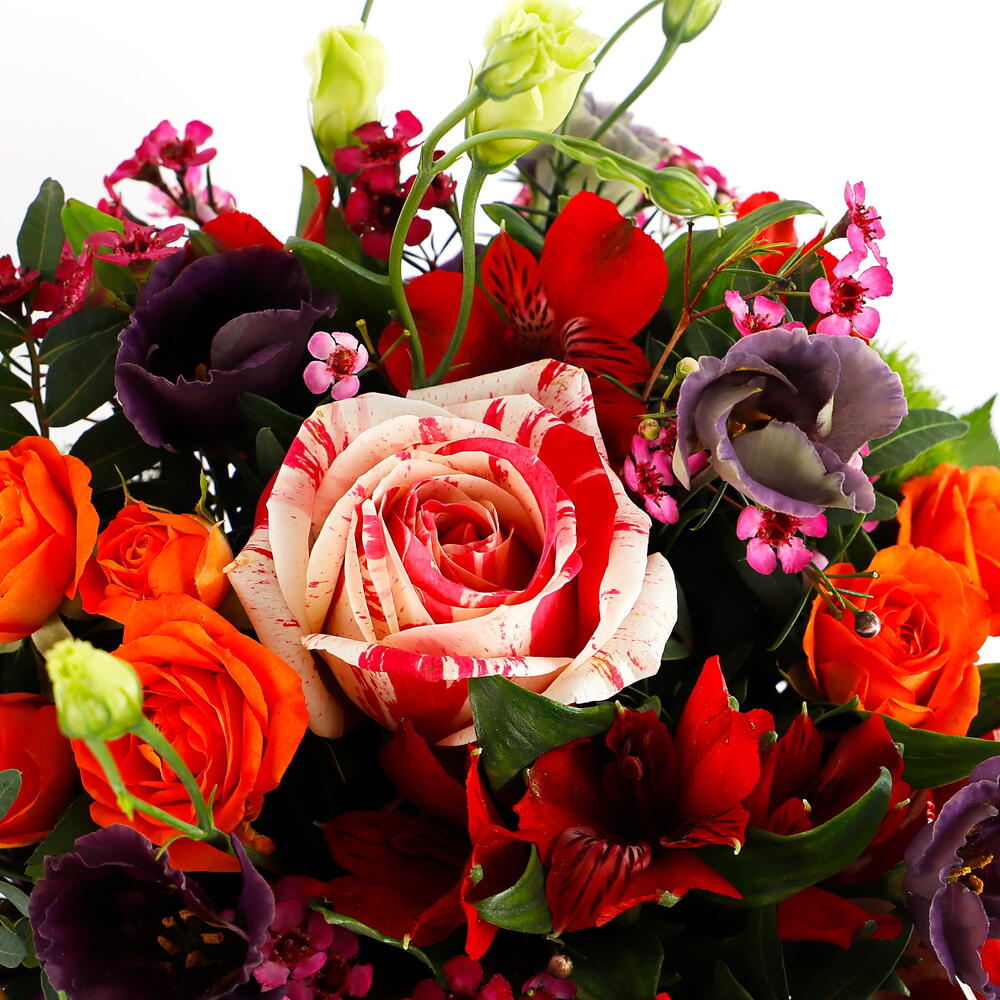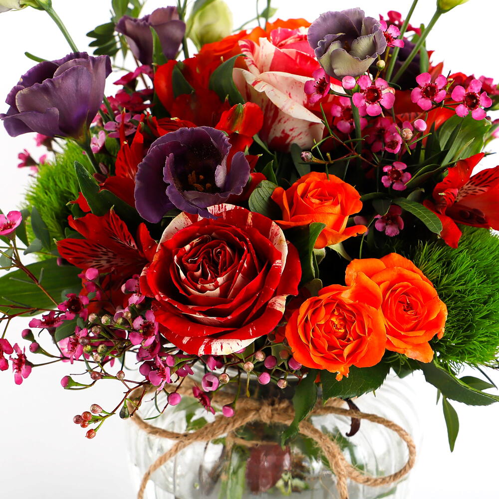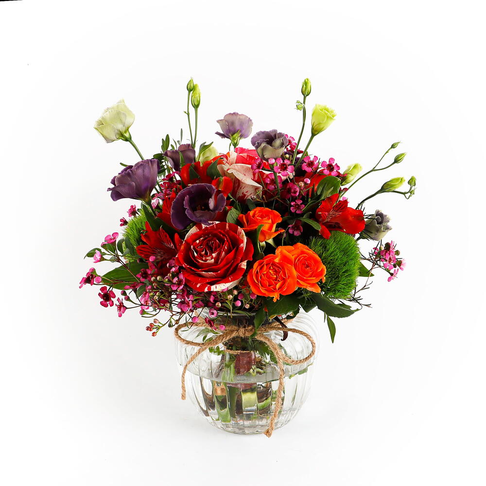 Этот яркий букет — потрясающая смесь цветов и текстур: оранжевые розы, фиолетовый лизиантус и нежные розовые восковые цветы в сочетании с разнообразной пышной зеленью. Насыщенные оранжевые и фиолетовые тона красиво контрастируют с мягкими розовыми акцентами, создавая живую, но гармоничную композицию. Идеально подходит для любого случая, этот букет излучает тепло и энергию, становясь продуманным подарком, который поднимет настроение каждому. Профессионально оформленный в очаровательной стеклянной вазе, этот цветочный шедевр наверняка произведёт неизгладимое впечатление.