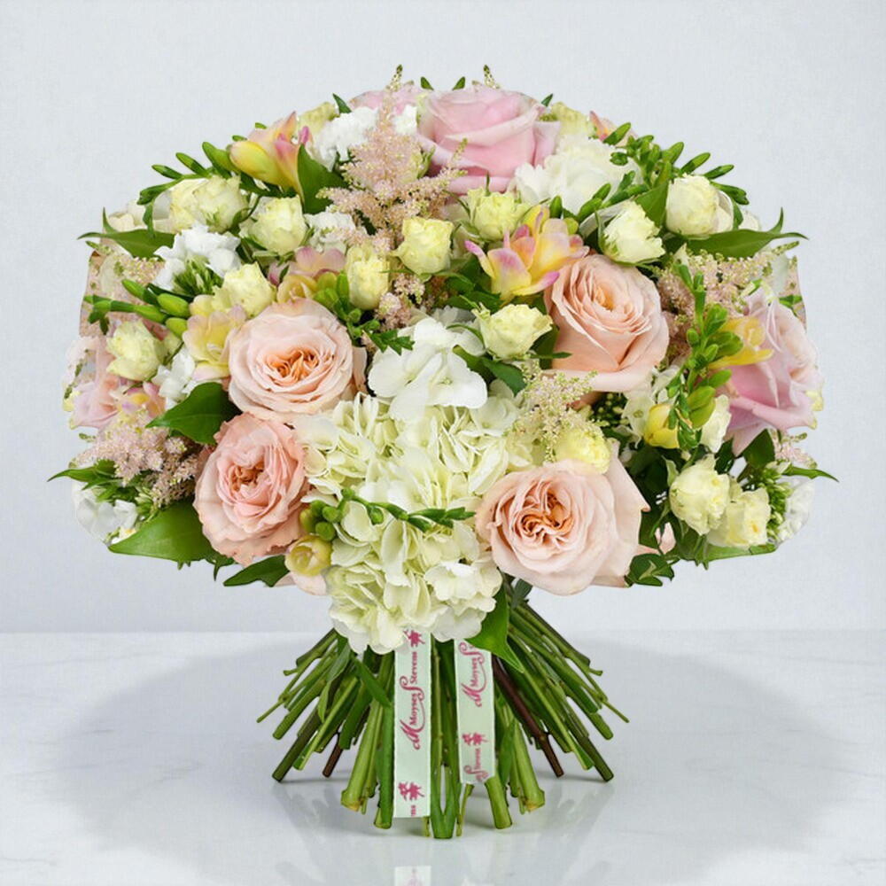 Пастельно-розовые тона и чистые белые оттенки создают эту композицию. Ароматные нежно-розовые фрезии и впечатляющие розы сбалансированы чисто-белыми цветами. Это классическое и всеми любимое сочетание цветов с сезонными фаворитами наших флористов.