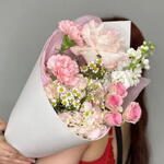 Погрузитесь в изысканную элегантность наших специальных букетов от флористов. Этот ручной букет включает два нежно-розовых гвоздики, осторожно окруженные парой сияющих ромашек. Композиция дополнительно украшена парой спрей-роз, которые излучают завораживающий аромат, одной величественной гортензией, одной розовой розой, отражающей красоту, а также тщательно подобранным цветком маттиолы. Собран с любовью и создан для захватывающего впечатления, этот букет наверняка покорит сердца и создаст моменты, которые стоит запомнить.