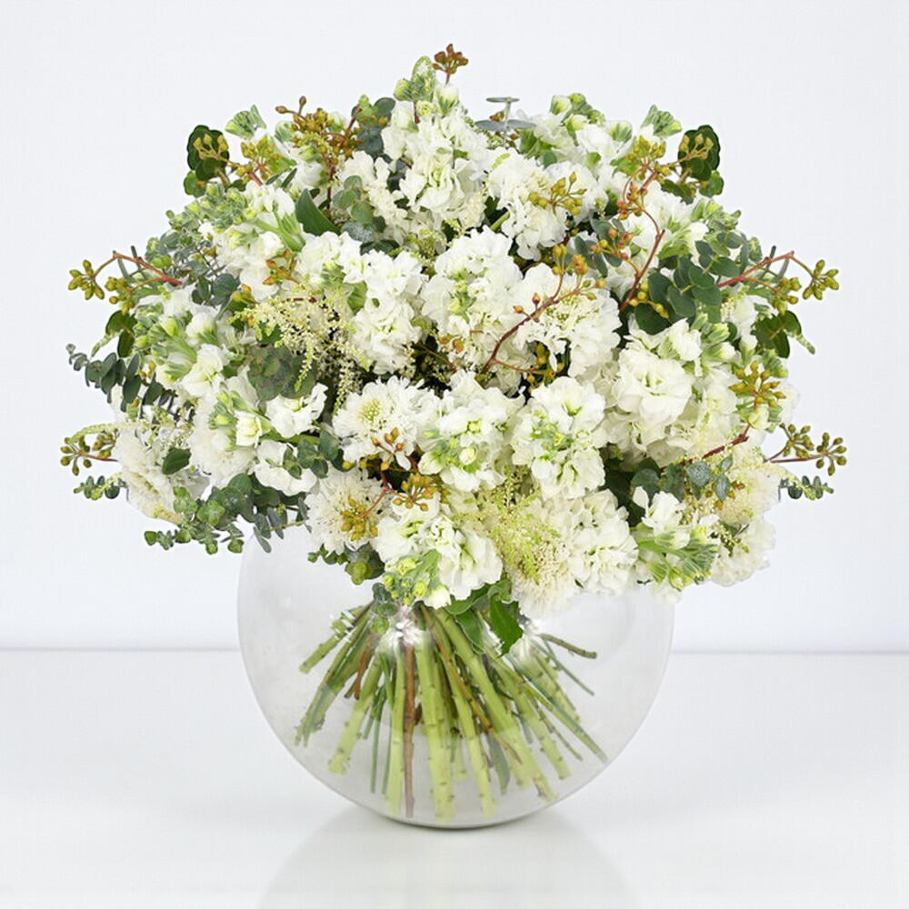 Чисто-белые маттиолы с их слегка благоухающими цветками соперничают с деликатно ароматным эвкалиптом, создавая этот сладко пахнущий букет. Классическая цветовая палитра чистых белых оттенков использует одни из лучших летних цветов — от мягкой и пушистой астильбы до изящной скабиозы, разбросанной по всему букету. Этот букет сочетает классический и вневременной выбор цвета с приятным мягким ароматом, пронизывающим его.