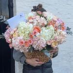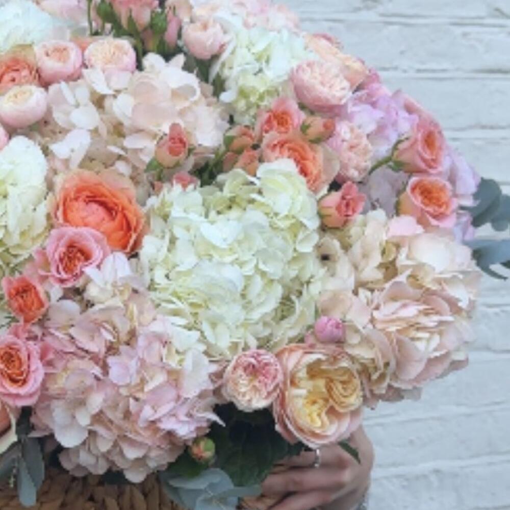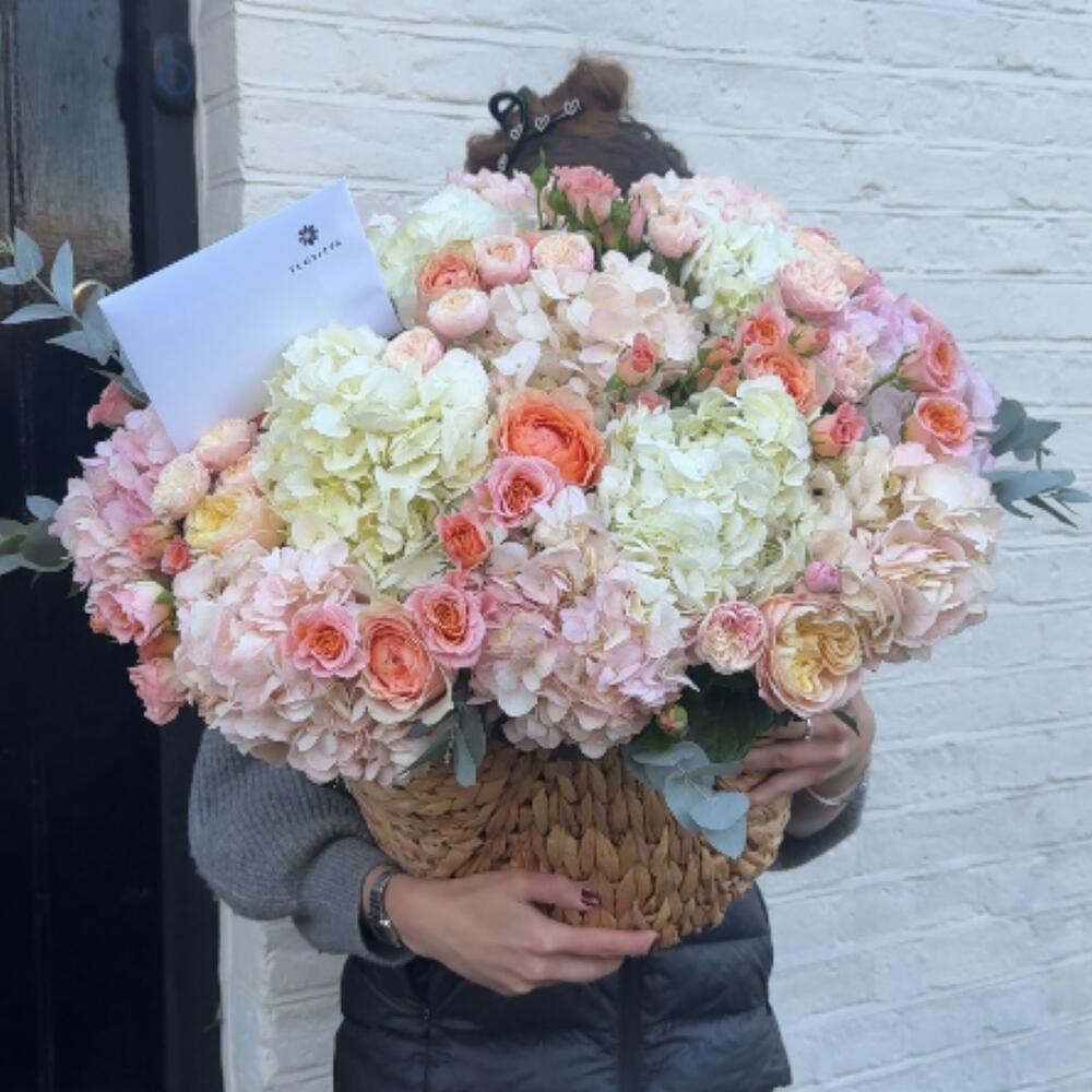 This breathtaking bouquet is a vision of romance and elegance. Overflowing with lush hydrangeas in creamy white and soft blush tones, it is accented by vibrant peach and pink roses, creating a harmonious blend of colors. The delicate interplay of textures and hues is enhanced by subtle greenery and eucalyptus sprigs, adding a touch of freshness. Nestled in a rustic woven basket, this arrangement feels both luxurious and inviting, making it the perfect gift to celebrate love, joy, or a special occasion. A handwritten card tucked within adds a personal, heartfelt touch to this stunning floral masterpiece.