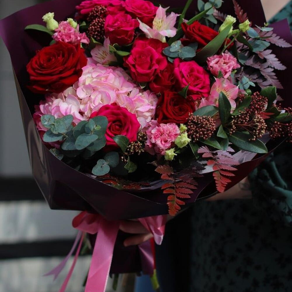 Eucaliptus - 5 шт. pink hydrangeas - 2 шт. pink lisianthus - 5 шт. красная скиммия - 5 шт. сезонная листва - 5 шт. red roses - 10 шт. розовые спрей-розы - 5 шт.